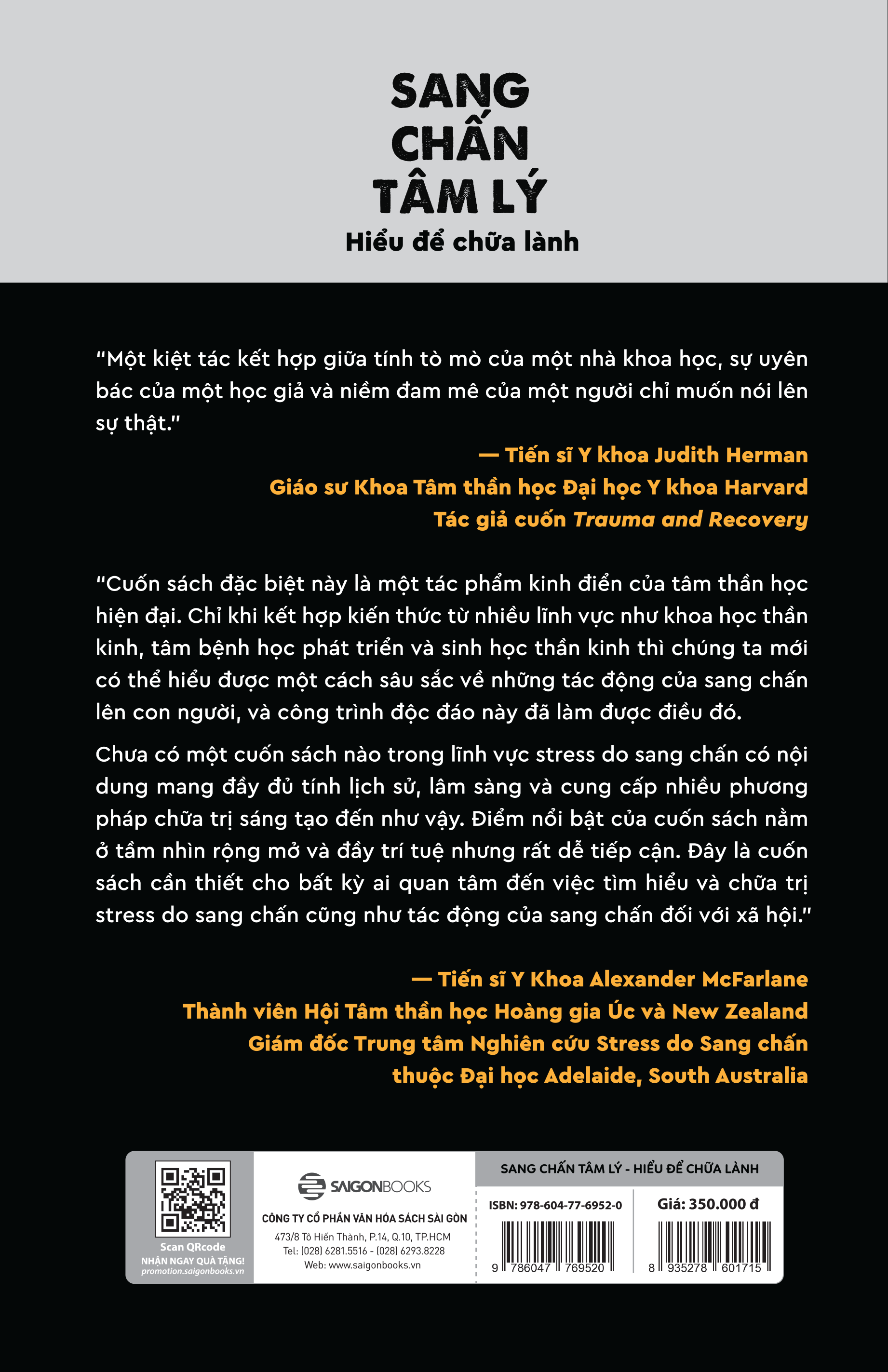 Một tác phẩm kinh điển của tâm thần học hiện đại được viết bởi Tiến sĩ Y khoa Bessel Van Der Kolk. Cuốn sách “Sang chấn tâm lý – Hiểu để chữa lành” là người bạn đồng hành với những người có nỗi đau tinh thần ở quá khứ và hiện tại.