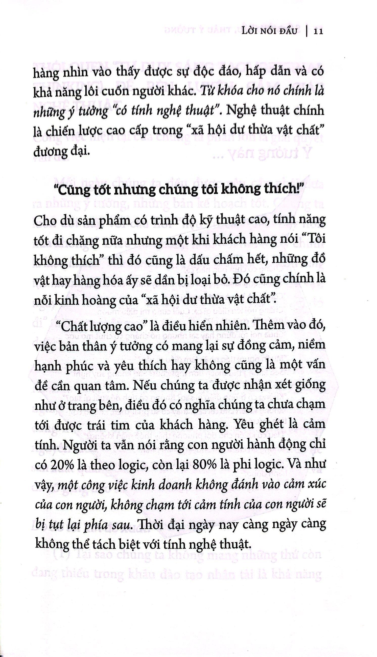 - Người làm việc kiểu phức hợp – “Nhà sản xuất” Phần 3. Những từ khóa kích thích nghệ thuật hóa Lời kết Tài liệu tham khảo Trích đoạn sách: Đúng nhưng không thú vị! Những lời phàn nàn như ví dụ ở trang 12 là những điều mà tôi thường thấy ở công ty quảng cáo Hakuhodo, nơi tôi đã từng làm việc. Những lời này nghe thì có vẻ rất trừu tượng, thế nhưng chúng lại thực sự thấm thía đối với những người trực tiếp làm công việc này. Cho dù người nói ra chúng có sử dụng từ ngữ một cách nhẹ nhàng như thế nào thì chúng cũng là những lời nói rất nặng nề. Đằng sau câu nói ấy chính là: vấn đề không nằm ở logic mà nằm ở việc ý tưởng không hề có cảm xúc hay không hề tô vẽ được cảm xúc ở phía sau đó, và không khiến cho đối phương cảm thấy hạnh phúc. Tất nhiên ở một công ty quảng cáo, nơi bán sự cá tính, độc đáo và chất xám thì những lời phàn nàn như thế này là điều hoàn toàn bình thường. Tuy nhiên, ngay cả trong giới kinh doanh mà chúng ta thường thấy, nơi việc thấu hiểu sâu sắc vị trí của khách hàng, lấy “sự độc đáo, cá tính” làm sức cạnh tranh thì có lẽ cũng chẳng bao lâu nữa, những từ ngữ thể hiện cảm xúc con người như trên cũng sẽ xuất hiện. Một ý tưởng hay, một bản kế hoạch tốt, một phương án giải quyết hiệu quả, một chiến lược tuyệt vời, tất cả chúng đều cần phải có tiền đề là “đúng và thú vị”. Thú vị ở đây là gì? Thú vị có nghĩa là khách hàng nhìn vào thấy được sự độc đáo, hấp dẫn và có khả năng lôi cuốn người khác. Từ khóa cho nó chính là những ý tưởng “có tính nghệ thuật”. Nghệ thuật chính là chiến lược cao cấp trong “xã hội dư thừa vật chất” đương đại Cũng tốt nhưng chúng tôi không thích! Cho dù sản phẩm có trình độ kỹ thuật cao, tính năng tốt đi chăng nữa nhưng một khi khách hàng nói “Tôi không thích” thì đó cũng là dấu chấm hết, những đồ vật hay hàng hóa ấy sẽ dần bị loại bỏ. Đó cũng chính là nỗi kinh hoàng của “xã hội dư thừa vật chất”. “Chất lượng cao” là điều hiển nhiên. Thêm vào đó, việc bản thân ý tưởng có mang lại sự đồng cảm, niềm hạnh phúc và yêu thích hay không cũng là một vấn đề cần quan tâm. Nếu chúng ta được nhận xét giống như ở trang bên, điều đó có nghĩa chúng ta chưa chạm tới được trái tim của khách hàng. Yêu ghét là cảm tính. Người ta vẫn nói rằng con người hành động chỉ có 20% là theo logic, còn lại 80% là phi logic. Và như vậy, một công việc kinh doanh không đánh vào cảm xúc của con người, không chạm tới cảm tính của con người sẽ bị tụt lại phía sau. Thời đại ngày nay càng ngày càng không thể tách biệt với tính nghệ thuật.
