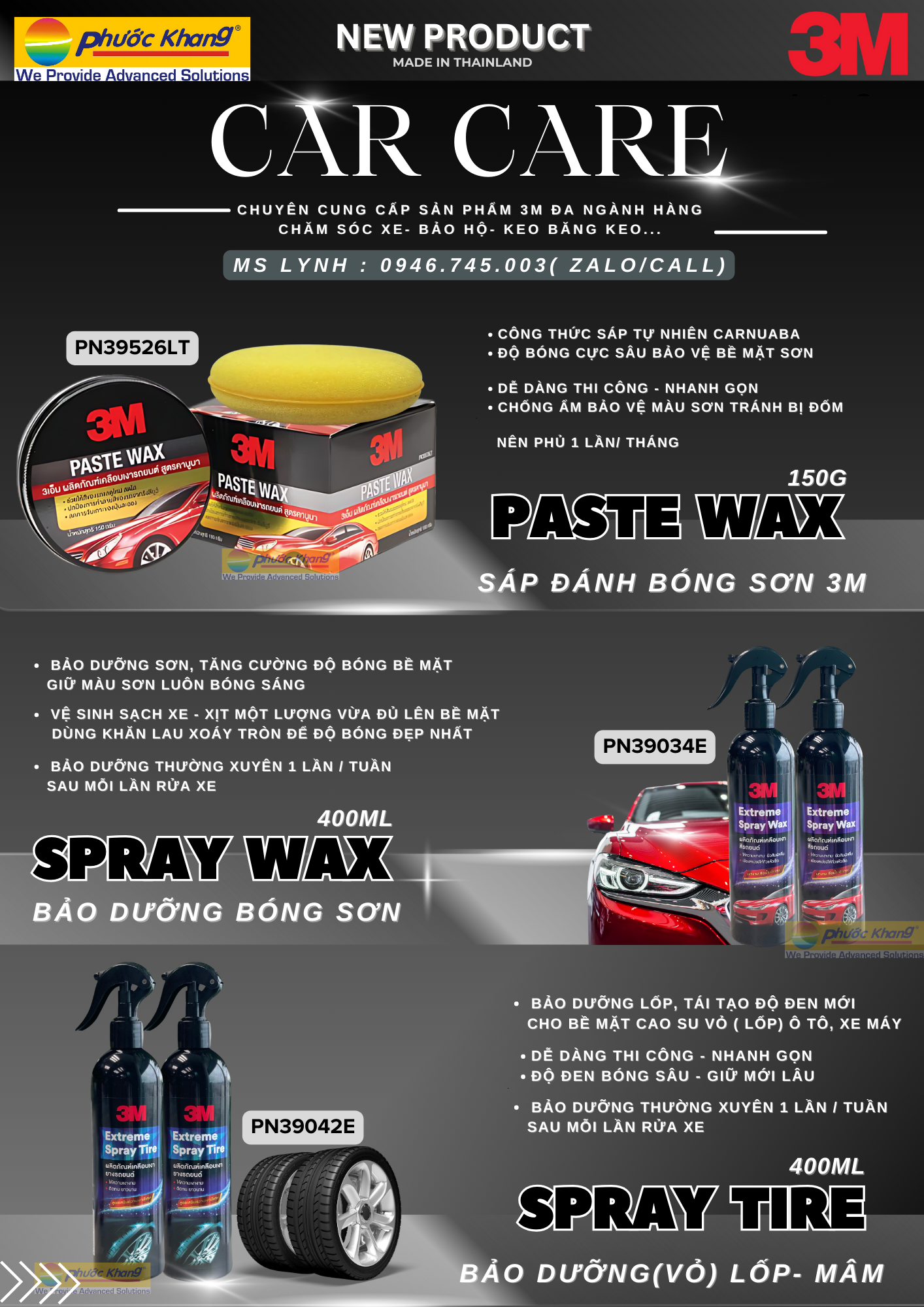 MàSẢN PHẨM: PN39526LT KHỐI LƯỢNG:150G  XUẤT SỨ: THÁI LAN CÔNGDỤNG:  Sản phẩm đánh bóng xe hơi với công thức kabuha cao cấp  -Bảo dưỡng bề mặt sơn xe luôn bóng bẫy, sáng loáng -Bảo vệ màu sơn khỏi tác động bên ngoài : tia uv, nắng, mưa,… -Giảm độ bám dính dưới tác động của bụi nước - Sản phẩm tạo độ bóng sâu là một trong các quy trình hoàn thiện bề mặt trong ngành xe hơi, hoàn thiện bề mặt hoàn hảo. Nên phủ 1-2 lần/ tháng  Dễ dàng sử dung, chỉ cần thao tác đơn giản: Bước 1: Rửa xe sạch và lau khô  Bước 2:Dùng miếng mút (đóng kèm) lấy 1 phần sáp vừa đủ và xoay tròn đều trên bề mặt sơn. Thoa tác tương tự cho hết bề mặt xe Bước 3: Dùng khăn mịn, khô lau lại cho đến khi đạt độ bóng tốt nhất. Nên dung khăn Microfibrer 3M để bảo vệ bề mặt tốt nhất