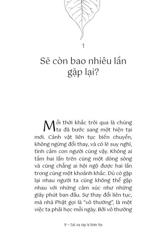 “Sát-na này là thiên thu” là cuốn sách được tác giả viết cho chính m.ình cũng là viết cho những người hữu duyên trên con đường hiểu và thương bất tận. Trong triết lý Phật giáo, Sát-na (Kṣaṇa) là một đơn vị phân chia thời gian vô cùng nhỏ (một sát-na bằng 0,013 giây) mà mọi thứ thay đổi, biến chuyển liên tục, không ngừng – một sát-na trôi qua đã có muôn vàn sự đổi thay, sinh diệt. Điều này có nghĩa là không có một cái gì tồn tại mãi mãi và chúng ta chỉ có một thời khắc để sống trọn vẹn trong chánh niệm, tỉnh giác – đó là giây phút hiện tại.