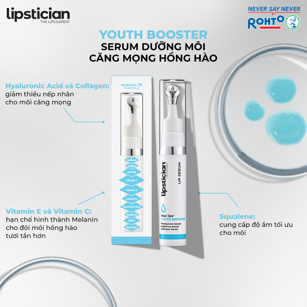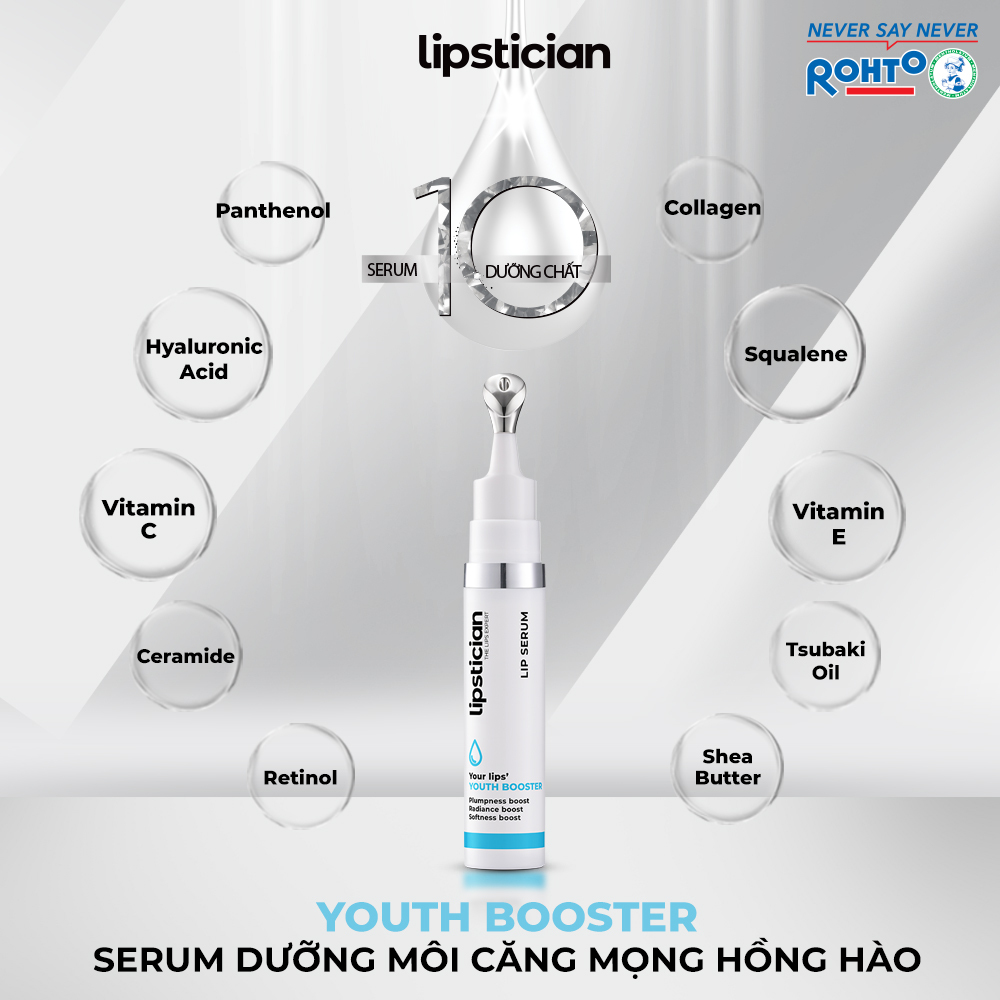 Mua tại TiktokSerum Dưỡng Môi Căng Mọng Hồng Hào Lipstician Lip Serum Youth Booster (9g) Serum dưỡng môi Lipstician Lip Serum được đúc kết và chọn lọc từ kinh nghiệm hơn 130 năm chăm sóc làn môi trong nhiều thập kỷ. Công thức Essential 10 bao gồm 10 thành phần an toàn & hiệu quả, với tỷ lệ kết hợp tối ưu để chăm sóc và giải quyết các vấn đề về môi hiệu quả nhất. Thông tin sản phẩm: