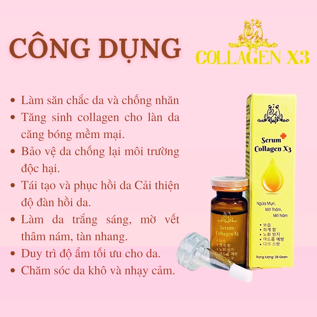 - Serum collagen x3 giảm các dấu hiệu lão hoá, nếp nhăn, da không đều màu, các tổn thương sẽ mờ dần và làn da sẽ cảm thấy khoẻ mạnh hơn và săn chắc hơn. CÔNG DỤNG