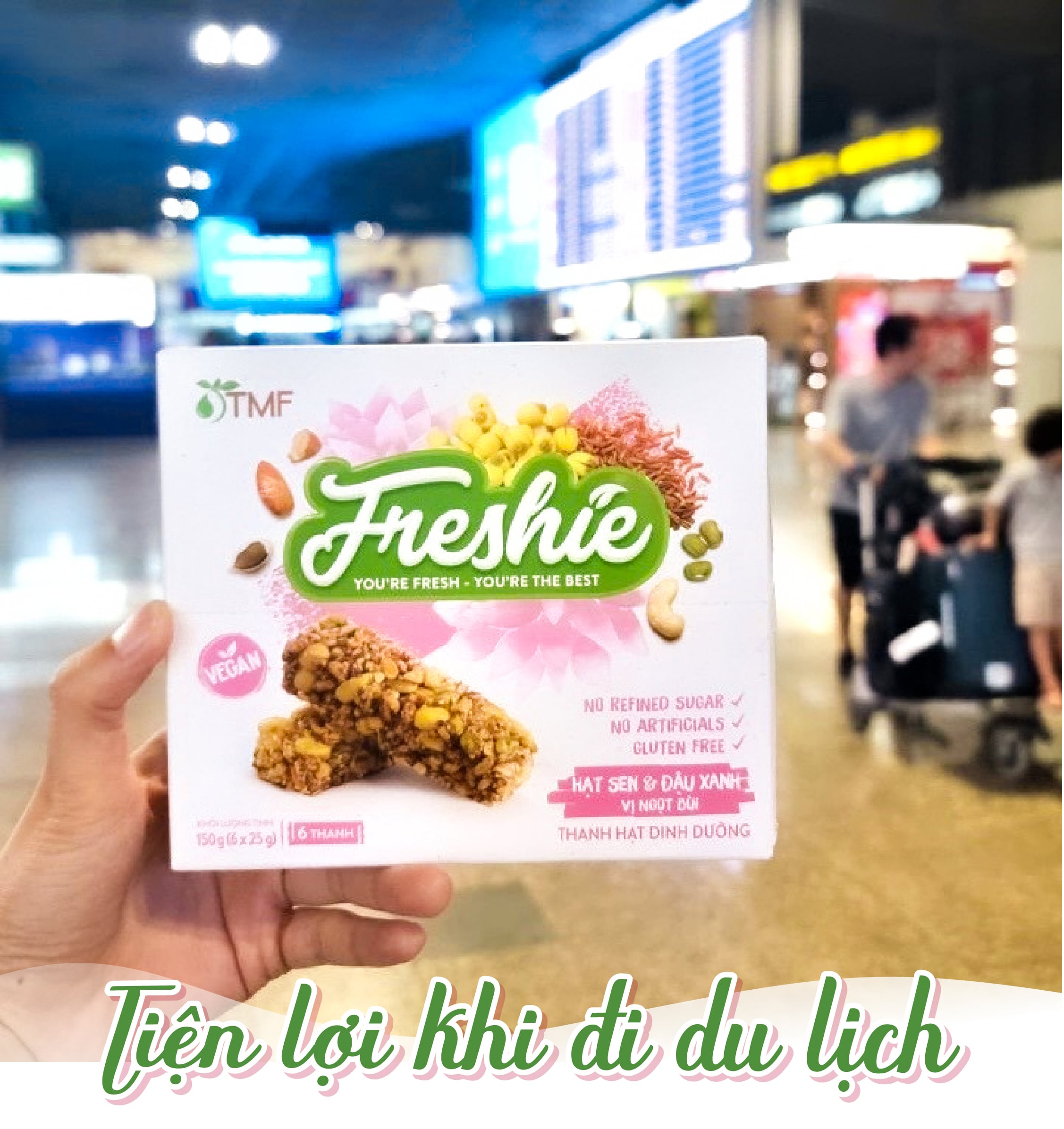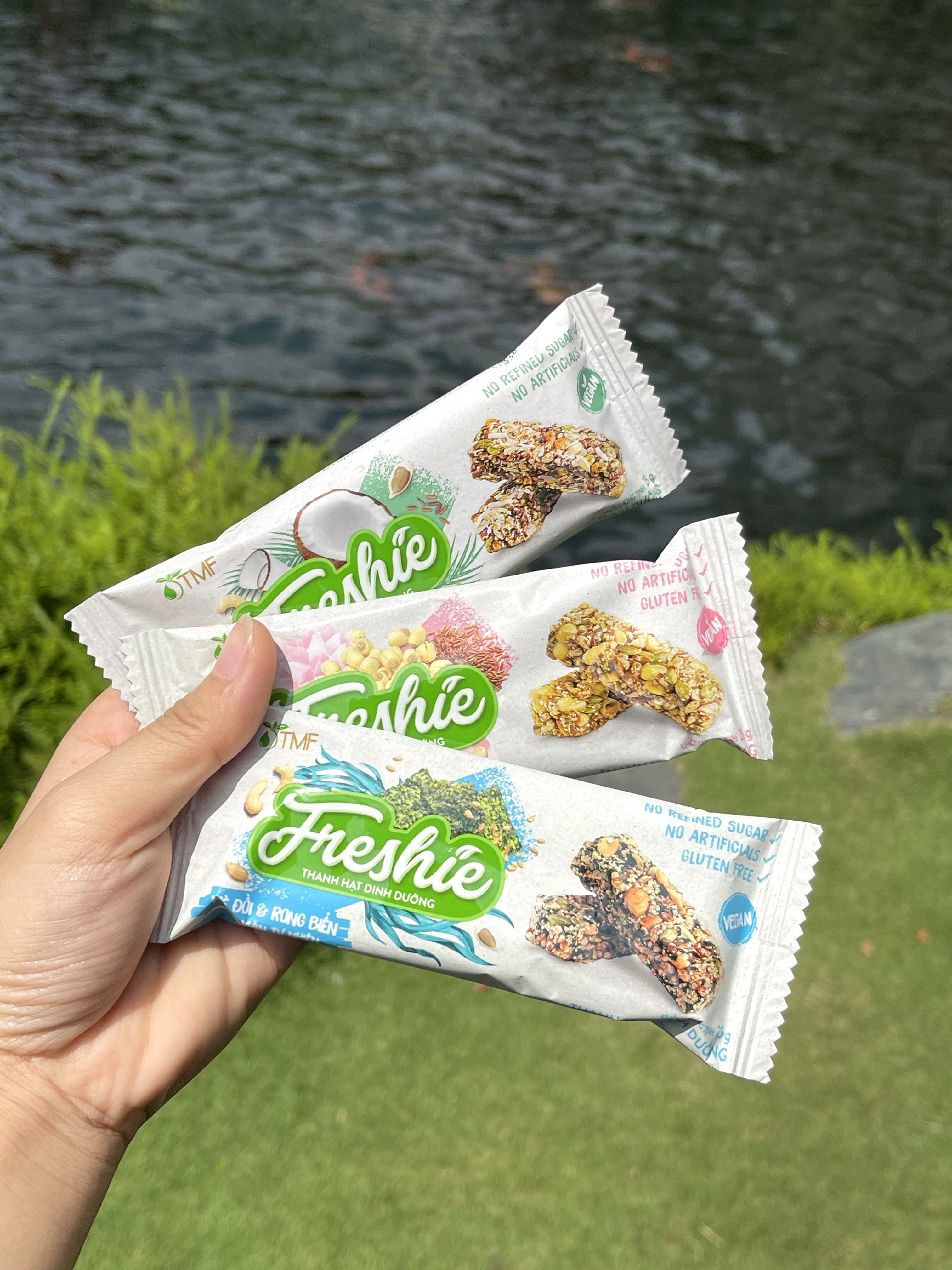 “You’re Fresh – You’re The Best”  ->  Thanh Hạt Dinh Dưỡng Freshie của TMF mang đến nguồn năng lượng tươi mới, khi ăn thanh Freshie bạn sẽ cảm thấy như được tiếp sức trẻ năng động, tự tin, sáng tạo để học tập, làm việc và trở thành “the best version” - phiên bản tốt nhất của chính mình.     Thanh hạt dinh dưỡng Freshie được làm từ các nông sản thuần Việt, không chứa đường tinh luyện, không hương liệu và chất bảo quản, an toàn cho sức khỏe. Với thông điệp You’re fresh, You’re the best, Năng lượng tươi mới - khởi sự tuyệt vời, thanh hạt dinh dưỡng Freshie là sự lựa chọn hoàn hảo, bổ sung năng lượng trước khi bắt đầu bất kỳ hoạt động nào; giúp bạn trở nên năng động và có một khởi đầu tuyệt vời hơn bao giờ hết. Hãy thử Freshie và cảm nhận sự khác biệt nhé!     Điểm khác biệt của Freshie _100% thuần thực vật _Sử dụng mật dừa nước tạo độ ngọt thanh _Không chiên qua dầu _Không sử dụng đường tinh luyện _Không chất bảo quản, hương liệu, phẩm màu _Các loại hạt chọn lọc cao cấp _Phù hợp mọi lứa tuổi, tiện dụng mang theo mọi lúc mọi nơi _Dây chuyền sản xuất khép kín, hiện đại trong nhà máy đạt chuẩn ISO22000:2018   Hạn sử dụng: 12 tháng kể từ ngày sản xuất   Sản xuất tại: CÔNG TY TNHH THỰC PHẨM TÂM MINH Tiêu chuẩn nhà máy: ISO22000:2018, FDA