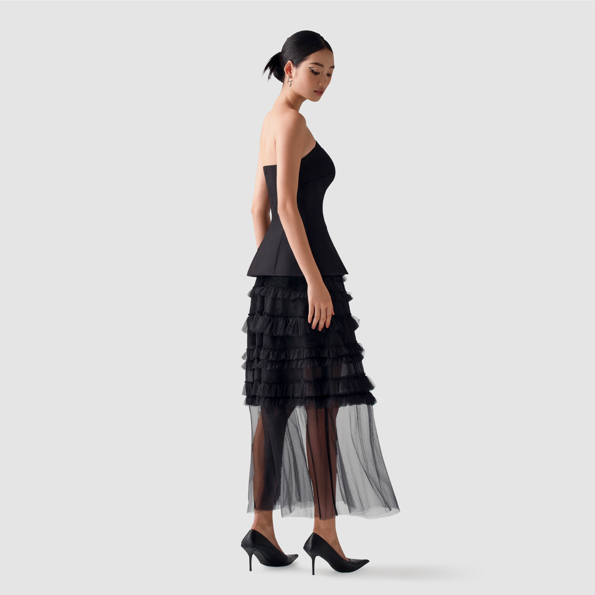 ღ THÔNG TIN SẢN PHẨM: Tên sản phẩm: Set áo váy đen chân váy tơ xám Chất liệu: Chất gân ý - voan tơ Chi tiết sản phẩm: không lót Thông