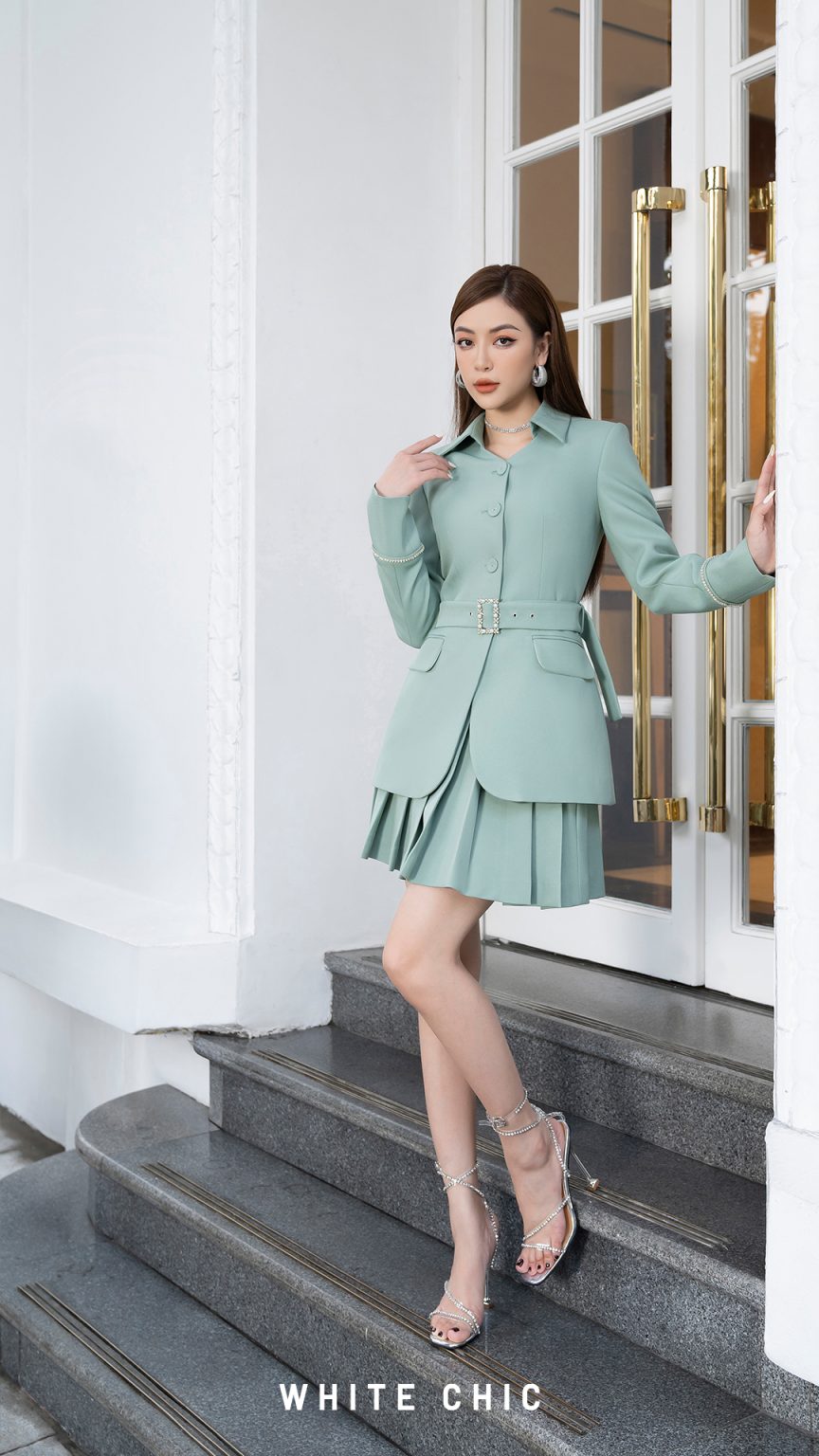 Thiết kế chạm tới sự thanh khiết và trang nhã với sắc xanh mint dịu mắt, tôn lên dáng vẻ dịu dàng nhưng không kém phần sang trọng, sắc sảo của quý cô hiện đại. Thiết kế áo cổ đức thanh lịch, gấu áo ôm tròn trẻ trung, túi ốp đặc trưng được đặt để hợp lí tạo điểm nhấn độc đáo cho tổng thể. Phần chân váy cạp rời xoè nhẹ vừa vặn tôn dáng và đường dập ly cầu kì mang đến sự nhẹ nhàng và uyển chuyển theo từng nhịp bước. Set đồ sử dụng lối hoà sắc ton-sur-ton, đặc biệt tạo điểm nhấn với dây lưng có gắn phụ kiện ôm sát cơ thể, tạo cảm giác tôn eo, che khuyết điểm vòng hai, thể hiện sự tinh tế gửi gắm trong từng chi tiết nhỏ. Sản phẩm phù hợp diện đi tiệc, hẹn hò, dạo phố cùng bạn bè, gia đình. Có thể kết hợp cùng giày cao gót và các phụ kiện đi kèm.