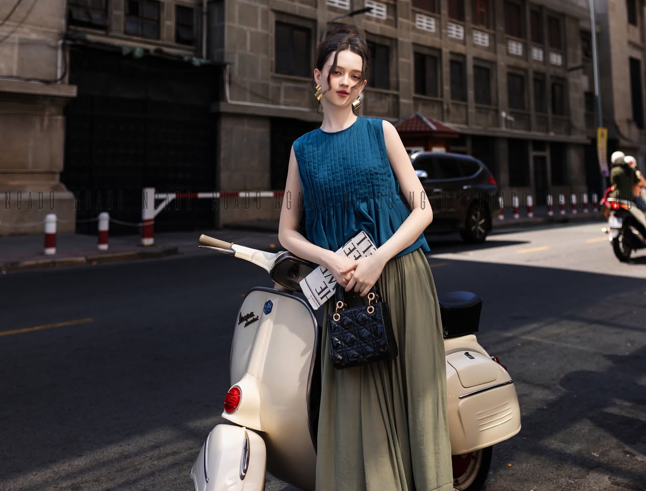 ✨Set áo váy xanh xếp ly NGADO , set áo váy kiểu Nữ , set áo váy dài