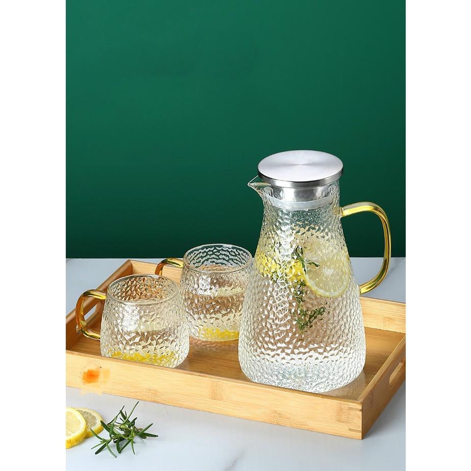 ✨Set bình đựng nước thủy tinh kèm 6 cốc vân sần thấp và khay gỗ