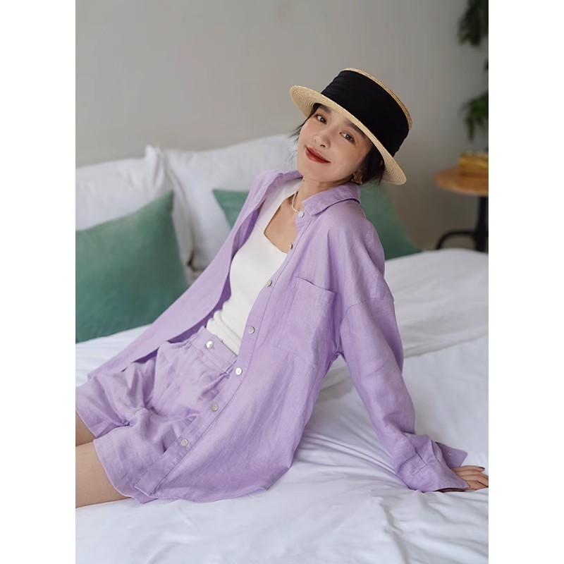 ✨Set bộ áo sơ mi và quần short màu tím pastel nhẹ nhàng, dễ thương, phong cách Hàn Quốc, thích hợp đi chơi, đi làm, đi biển