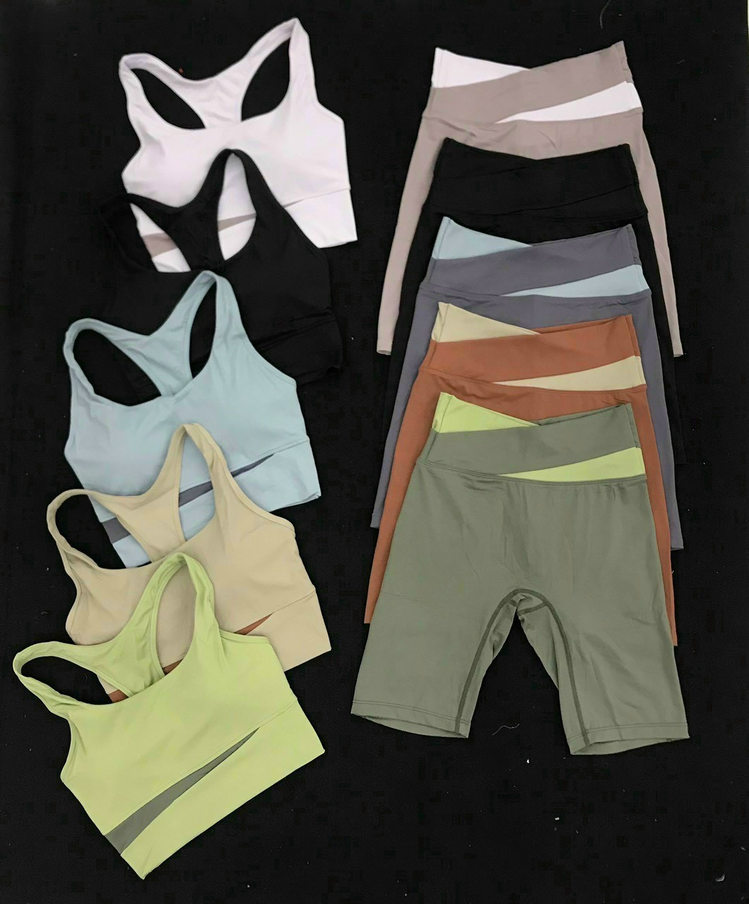 Chất liệu : thun dệt gân dày dặn, co giãn 4 chiều , thoáng khí , thấm mồ hôi tốt Kiểu dáng : quần ngắn cạp cao , áo 2 dây , phần mông có