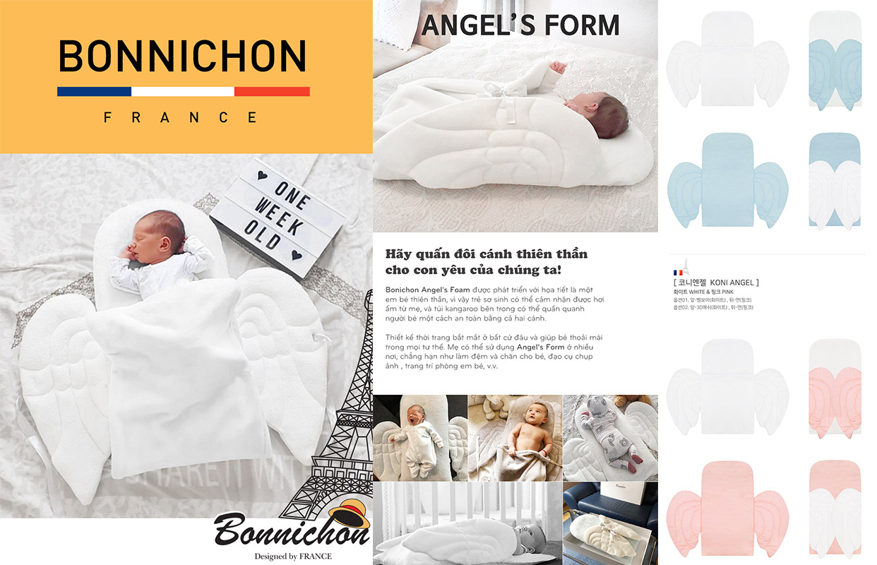 Set chăn đệm sơ sinh thiên thần BONNICHON Angel's Form (Chính hãng Hàn Quốc) BONNICHON là tiếng Pháp, có nghĩa là "chiếc mũ nhỏ", dựa trên chất liệu hữu cơ và vải sợi, một chất liệu tự nhiên được sử dụng rộng rãi làm sản phẩm cho trẻ em ở Pháp. Bonnichon Angel's Form được phát triển với họa tiết là một em bé thiên thần, vì vậy trẻ sơ sinh có thể cảm nhận được hơi ấm từ mẹ, và túi kangaroo bên trong có thể quấn quanh người bé một cách an toàn bằng cả hai cánh. Thiết kế thời trang bắt mắt ở bất cứ đâu và giúp bé thoải mái trong mọi tư thế. Mẹ có thể sử dụng Angels Form ở nhiều nơi, chẳng hạn như làm chăn đệm cho bé, giảm chứng giật mình cho bé, đạo cụ chụp ảnh, trang trí phòng em bé,     Vì sao mẹ nên chọn Set chăn đệm sơ sinh thiên thần BONNICHON Angel's Form cho bé ?