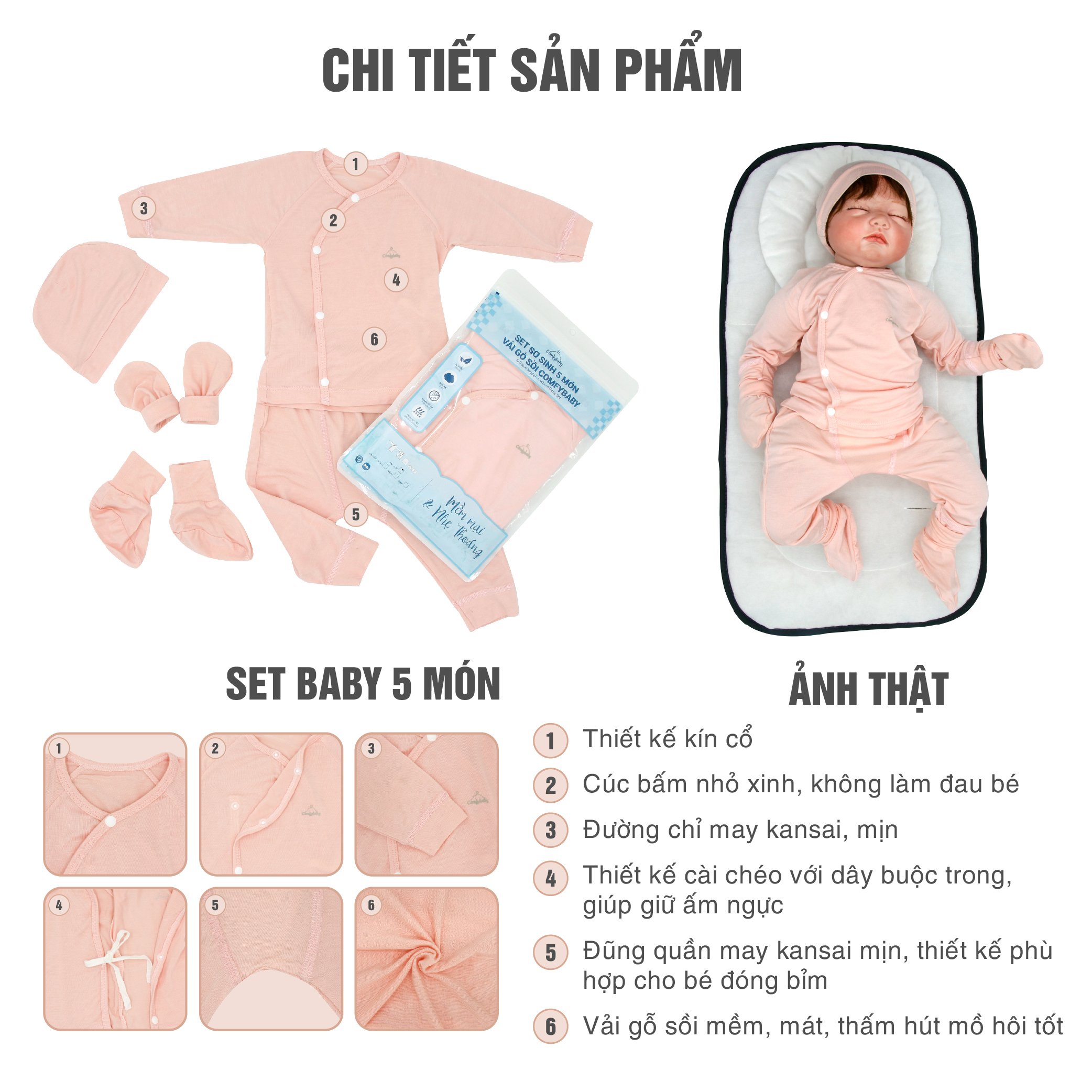 - Set quần áo sơ sinh 5 chi tiết được làm từ vải Modal- một loại vải được làm từ bột cây gỗ Sồi.