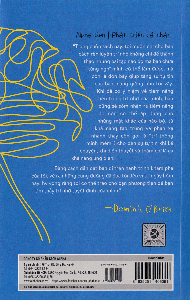 Siêu Trí Nhớ 15 bài tập đơn giản giúp bạn rèn luyện trí nhớ hiệu quả “Trong cuốn sách này, tôi muốn chỉ cho bạn cách rèn luyện trí nhớ. Mục đích không chỉ để thành thạo những bài tập não bộ mà bạn chưa bao giờ nghĩ là mình có thể làm được, mà còn là đòn bẩy giúp tăng sự tự tin của bạn, cũng giống như tôi vậy. Khi bạn đã có ý niệm về tiềm năng bên trong trí nhớ của mình, thì bạn cũng sẽ sớm nhận ra tiềm năng đó còn có thể áp dụng cho những mặt khác của não bộ, từ khả năng tập trung và phản xạ nhanh nhạy (hay còn gọi là “trí thông minh mềm”) cho đến sự tự tin khi kể chuyện, khi diễn thuyết và thậm chí là cả khả năng ứng biến. Bằng cách dẫn dắt bạn đi trên hành trình khám phá của tôi, vẽ ra những cung đường đã đưa tôi đến vị trí ngày hôm nay, tôi hy vọng rằng, tôi có thể trao cho bạn phương tiện để bạn tìm thấy trí nhớ tuyệt đỉnh của mình.”