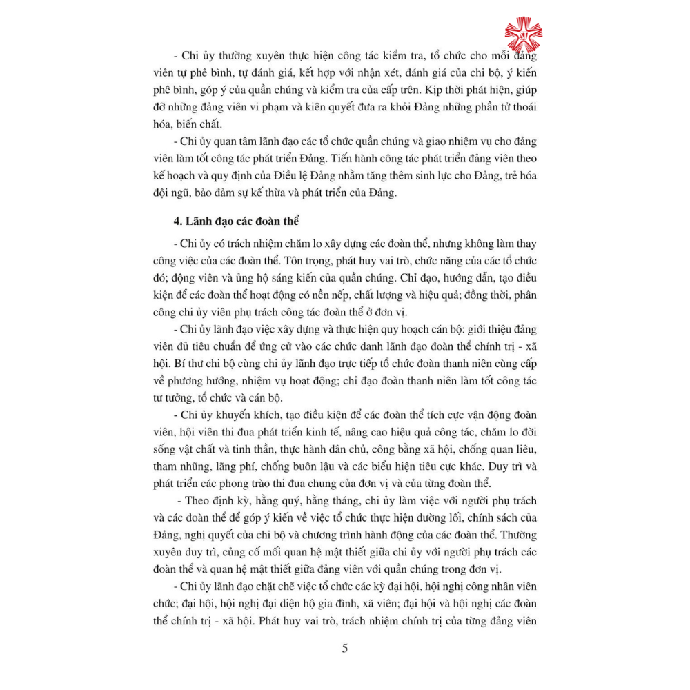 • Các trang mẫu sẵn ghi thông tin thu Đảng phí. Sổ ghi công văn đi, đến Phần 1 (Quy định về cách ghi công văn đi đến của chi bộ); Phần 2: trang mẫu sẵn ghi thông tin: Số thứ tự, ngày tháng, số công văn đi, đến; nội dung công văn… Sổ tay Bí thư Chi bộ và Chi ủy viên Phần 1 (Nâng cao chất lượng sinh hoạt chi bộ; Nhiệm vụ của Chi ủy và Bí thư Chi bộ; Một số văn bản, biểu mẫu của chi bộ thường sử dụng). Phần 2: trang trắng để ghi chép. Sổ tay đảng viên