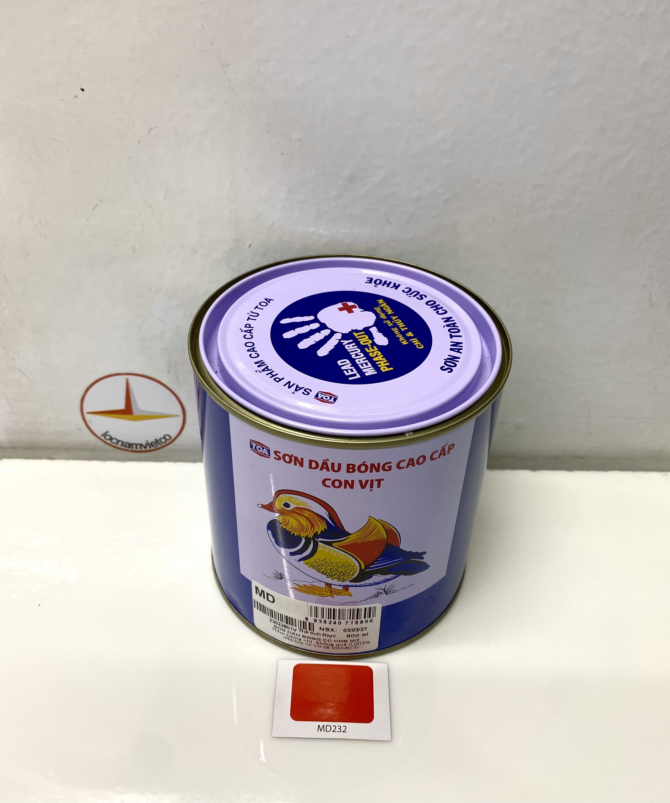 Mua tại TiktokSơn dầu cao cấp Toa hiệu Con Vịt màu đỏ cam MD232_800ML Sơn dầu bóng cao cấp Con Vịt (Mandarin Duck) là loại sơn Alkyd chất lượng cao, không sử dụng Chì & chất gây hại, là loại sơn an toàn cho sức khoẻ với các tính năng: Khô nhanh, màng sơn bóng đẹp, độ phủ cao, chống nấm mốc, màu sắc tươi đẹp.