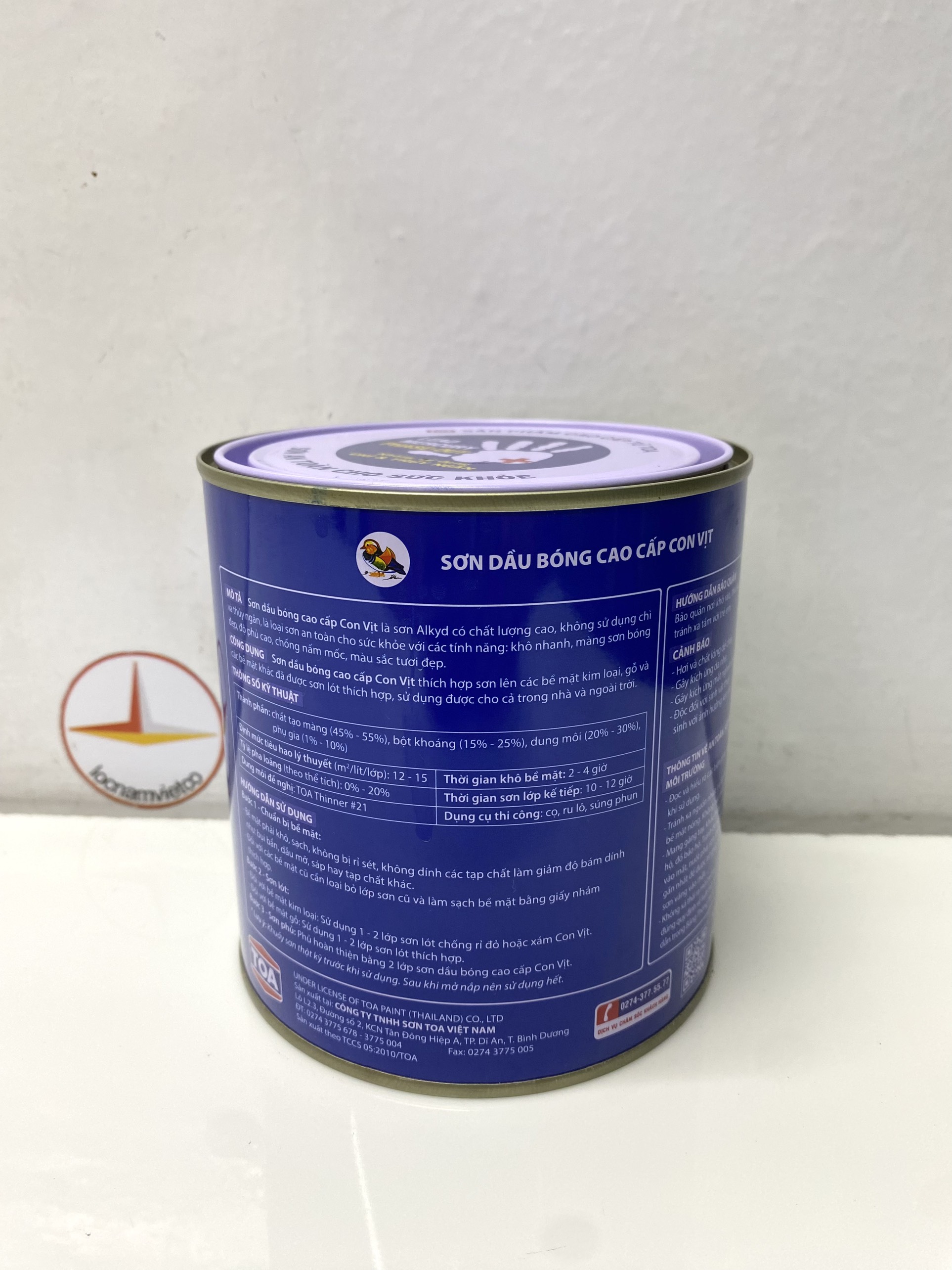 Mua tại TiktokSơn dầu cao cấp Toa hiệu Con Vịt màu trắng mờ MD222_800ML Sơn dầu bóng cao cấp Con Vịt (Mandarin Duck) là loại sơn Alkyd chất lượng cao, không sử dụng Chì & Chất gây hại, là loại sơn an toàn cho sức khoẻ với các tính năng: Khô nhanh, màng sơn bóng đẹp, độ phủ cao, chống nấm mốc, màu sắc tươi đẹp.