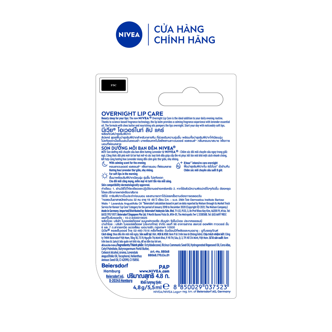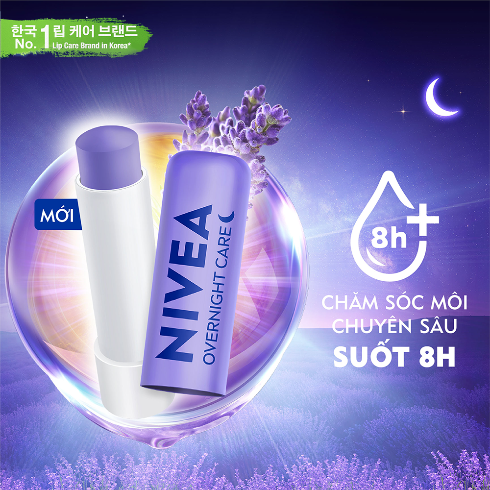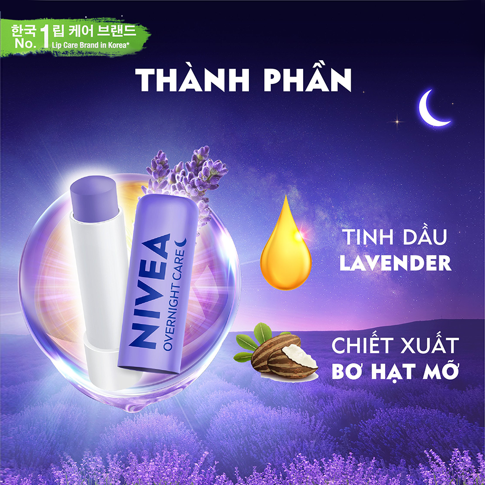 Mua tại TiktokSON DƯỠNG MÔI BAN ĐÊM NIVEA - Nhãn hiệu Son dưỡng số 1 tại Hàn Quốc MỚI! Son dưỡng môi chuyên sâu ban đên hương Lavender từ NIVEA - Chăm sóc đôi môi chuyên sâu ngay trong giấc ngủ suốt 8 giờ - Công thức đột phá mới từ bơ hạt mỡ & các loại tinh dầu giúp cấp ẩm và phục hồi làn môi khô một cách nhanh chóng, kết hợp cùng hương hoa Lavender mang đến cảm giác thư giãn, nhẹ nhàng.