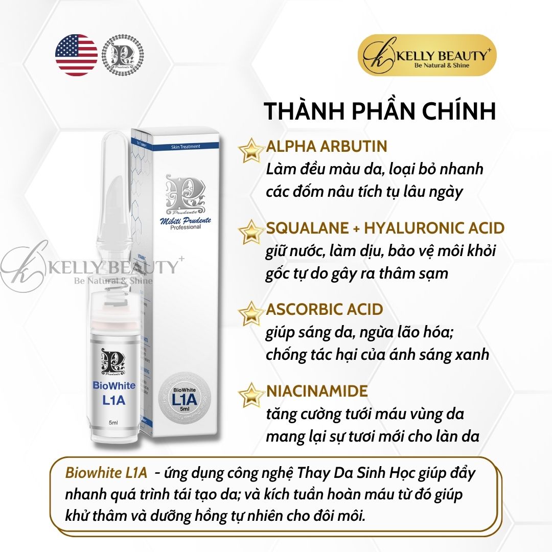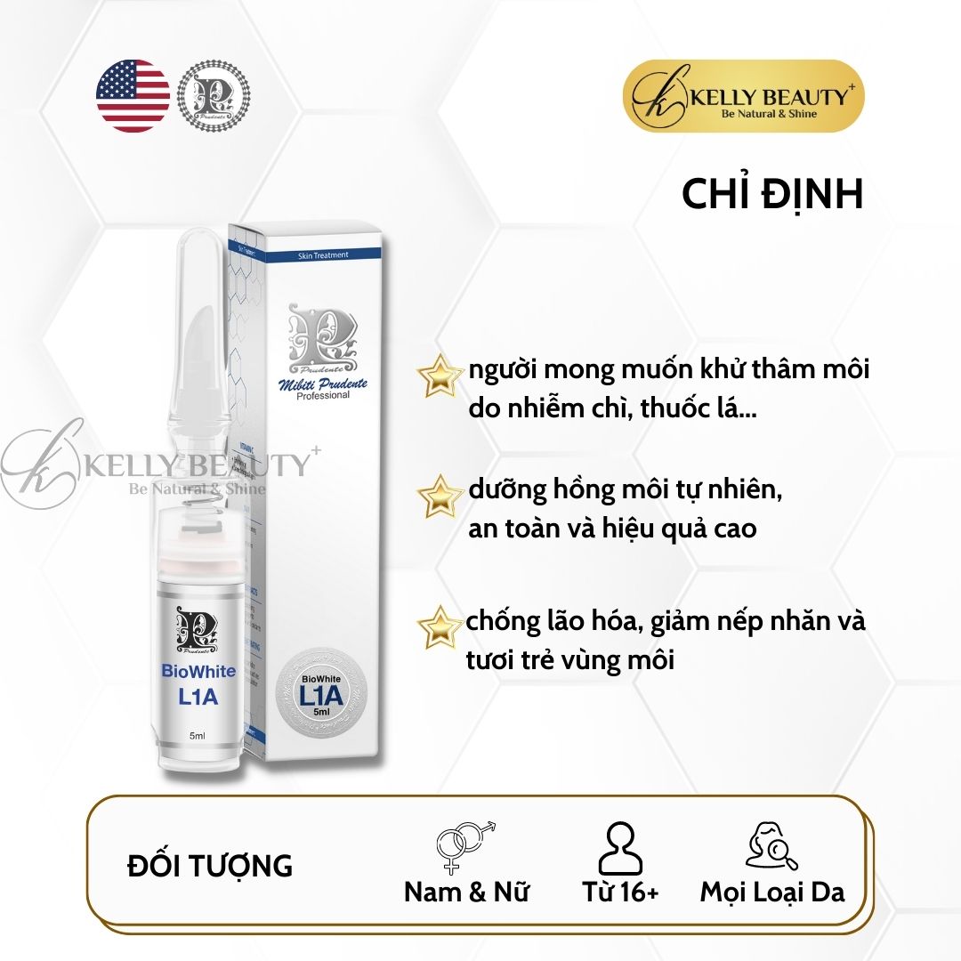 - Mibiti Prudente Biowhite L1A hỗ trợ ức chế sản sinh hắc tố melanin mới, đồng thời thúc đẩy và tưới máu cho vùng môi hồng hào tự nhiên.