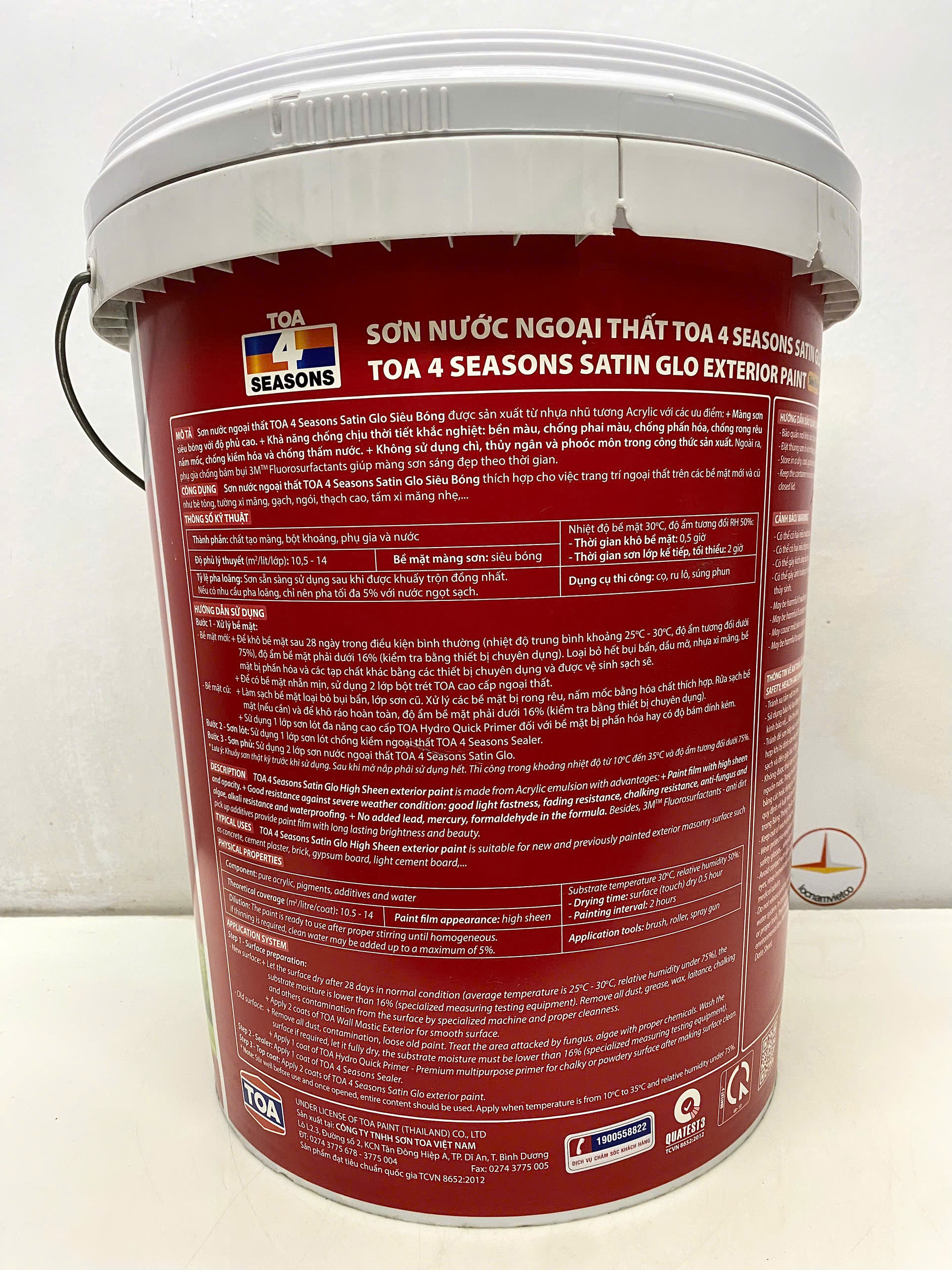 - MỤC ĐÍCH SỬ DỤNG: Sơn Nước Toa4 seasons satin glo siêu bóng thích hợp cho việc trang trí ngoại thất trên các bề mặt mới và cũ như tường xi măng, bê tông, thạch cao, gạch, ngói, tấm xi măng nhẹ, v.v… Đóng gói: 1L; 5L; 18L Thời gian khô ở nhiệt độ 30oC: khô bề mặt 30 phút ; khô cứng:4h