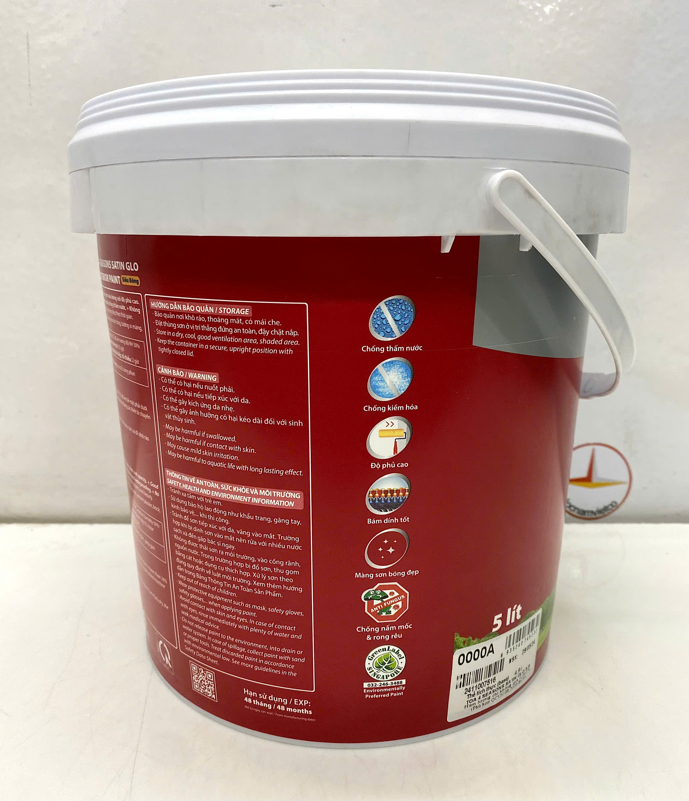 - MỤC ĐÍCH SỬ DỤNG: Sơn Nước Toa4 seasons satin glo siêu bóng thích hợp cho việc trang trí ngoại thất trên các bề mặt mới và cũ như tường xi măng, bê tông, thạch cao, gạch, ngói, tấm xi măng nhẹ, v.v… Đóng gói: 1L; 5L; 18L Thời gian khô ở nhiệt độ 30oC: khô bề mặt 30 phút ; khô cứng:4h