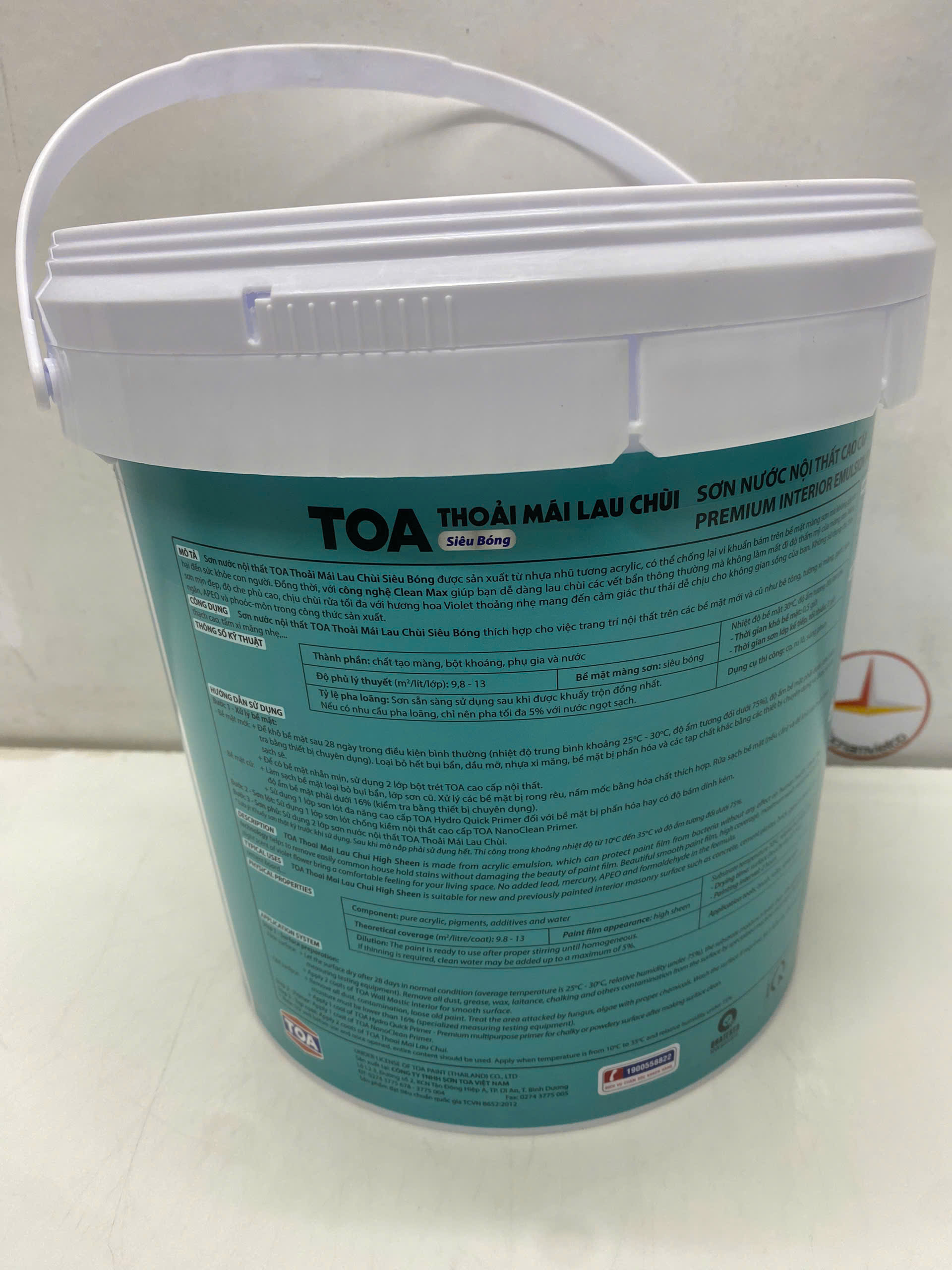 Độ phủ cao, màng sơn bóng mịn đẹp  MỤC ĐÍCH SỬ DỤNG: Sơn Nước Toathoải mái lau chùi siêu bóng  thích hợp cho việc trang trí nội thất trên các bề mặt mới và cũ như bê tông, tường xi măng, bê tông, thạch cao, gạch, ngói, tấm xi măng nhẹ, v.v...  ĐẶC TÍNH SẢN PHẨM:  - Thành phần cấu tạo: Chất tạo màng, Bột khoáng, Nước.  - Màu sắc: Nhiều màu Theo bảng màu và quạt  màu TOA  - Bề mặt hoàn thiện: Bóng  - Thể tích chất rắn: 39 ± 2 (% theo thể tích)  - Độ phủ lý thuyết: 10 – 13 m2/lít/lớp Độ phủ thực tế sẽ phụ thuộc vào khả năng dàn trải của màng sơn, độ dày màng sơn khô, bề mặt thi công, tay nghề thợ sơn và lượng sơn hao hụt thực tế khi thi công.  - Hàm lượng chất hữu cơ bay hơi (VOCs): ≤ 30 g/L  - Thời gian khô ở nhiệt độ 30 oC: khô bề mặt: 30 phút ; khô cứng:4h  - Đóng gói: 18L; 5L; 1L  - Dụng cụ: Cọ, ru-lô/con lăn,  súng phun sơn thông thường  - Tỉ lệ pha loãng: Sơn sẵn sàng sử dụng sau khi được khuấy trộn đồng nhất. Nếu có nhu cầu pha loãng, chỉ nên pha tối đa 5% với nước ngọt sạch. HƯỚNG DẪN THI CÔNG: Bước 1:  Xử lý bề mặt: Bề mặt mới: