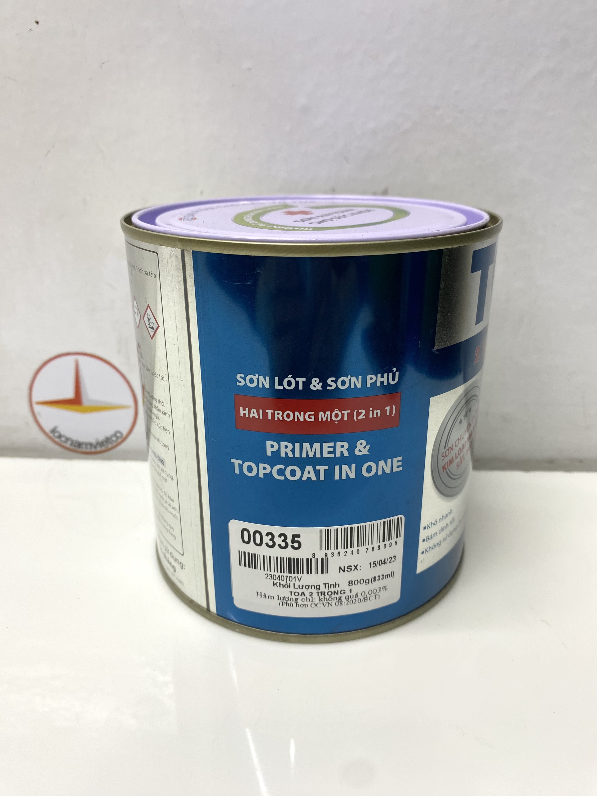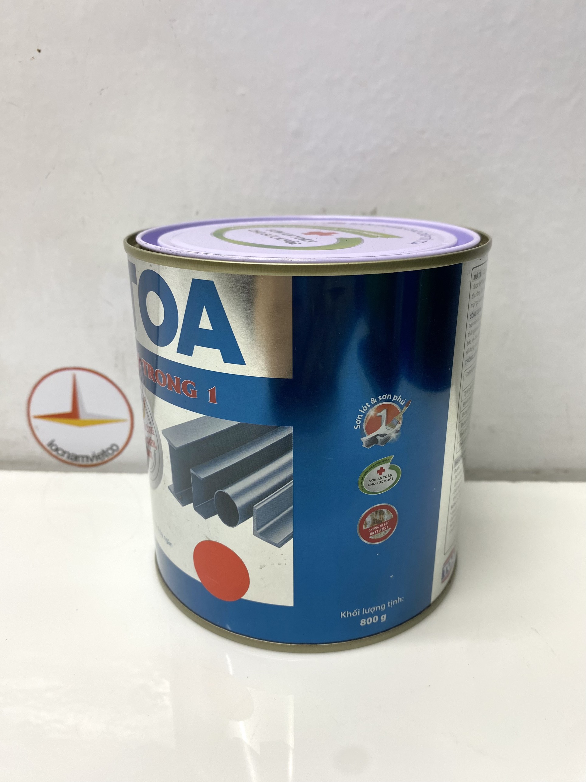 Không sử dụng crom, chì . THÔNG SỐ KỸ THUẬT Màu sắc: trắng 111, xanh 620, xanh 601, xanh 631, xanh 618, xanh lá 614, xám 125, 120, xanh 642, xanh 671, bạc 000, xám 192, trắng mờ 222, xám xingfa XF911, XF910, XF350, xám 189, xám 191, đen 999, đen mờ 888, đỏ 335, đỏ 336, đỏ nâu 720, cánh dán 721, kem 112, kem 115, vàng 445, 273 cam 232. Thành phần:chất tạo màng (40% - 60%), bột khoáng (20% - 30%), dung môi (25% - 35%), phụ gia (2% - 5%) Thời gian khô: Khô bề mặt:10 – 15 phút Sơn lớp kế tiếp:sau 1 giờ Định mức tiêu hao lý thuyết:8 – 10 (m2/kg/lớp) Đóng gói: 0.8 Kg; 3Kg PHƯƠNG PHÁP THI CÔNG Dụng cụ: cọ, ru lô, máy phun sơn Pha loãng: Dung môi TOA Thinner #74N hoặc xăng nhật Tỷ lệ pha loãng:tùy thuộc vào điều kiện thi công Quét cọ: 0% - 10% theo khối lượng HƯỚNG DẪN THI CÔNG Bước 1 - Chuẩn bị bề mặt: Bề mặt phải khô, sạch, không bị rỉ sét, không dính các tạp chất làm giảm độ bám dính như: bụi bẩn. dầu mỡ, sáp hay tạp chất khác Đối với các bề mặt cũ cần loại bỏ lớp sơn cũ và làm sạch bề mặt bằng giấy nhám thích hợp. Bước 2 - Sơn phủ: Phủ hoàn thiện bằng 2 – 3 lớp sơn TOA 2 trong 1 *Lưu ý: Khuấy sơn thật kỹ trước khi sử dụng. Sau khi mở nắp nên sử dụng hết. Nhận giao hàng: Vũng Tàu, Bình Dương, Bình Phước, Long An, Đồng Nai, TP.HCM gửi hàng đi Toàn Quốc giá rẻ.