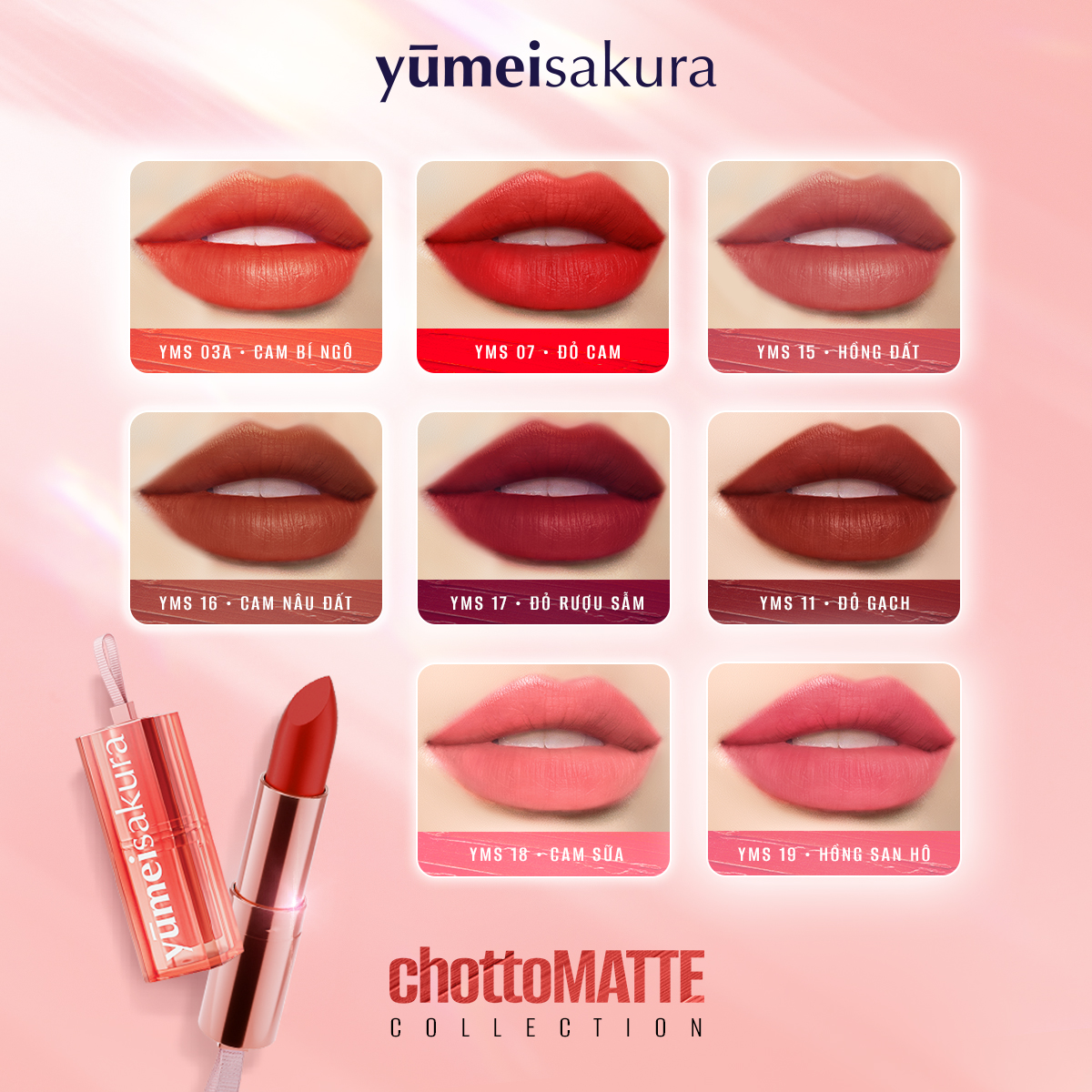 - Thiết kế mới độc đáo, sang trọng và tiện dụng BẢNG MÀU VỚI 08 MÀU SON THỜI THƯỢNG: Tháng 05/2023, Yumeisakura chính thức chào đón thêm 3 màu son mới “quen mà lạ, lạ mà quen” vào bảng màu đa sắc son ChottoMATTE. YMS11 - Kiss Me Maroon - Đỏ gạch (Mới): Nụ hôn nồng nàn khiến bao trái tim thổn thức YMS18 - Milky Orange - Cam sữa (Mới): Sự kiêu sa đầy quyến rũ của phụ nữ hiện đại YMS19 - Sweetie Coral Pink - Hồng san hô (Mới): Tô điểm nét duyên dáng đầy khí chất YMS03A - Pumpkin Orange - Cam Bí Ngô: Bùng nổ năng lượng sôi nổi tích cực YMS07 - Candy Apple - Đỏ Cam: Thỏa đam mê nổi bật YMS15 - Love Me Tony Pink - Hồng Đất: Dịu dàng, nữ tính và ngọt ngào YMS16 - Bronze Orange - Cam Nâu Đất: Tôn vinh nét phóng khoáng, cá tính độc bản YMS17 - Burgundy Red - Đỏ Rượu Sẫm: Quyến rũ, sang trọng và quyền lực Sở hữu những màu sắc trendy, thời thượng và lôi cuốn, 8 màu son của Yumeisakura hứa hẹn sẽ khiến hàng triệu cô gái mê mệt trước sự quyến xinh đẹp, quyến rũ này! THIẾT KẾ MỚI ĐỘC ĐÁO VÀ ẤN TƯỢNG Thiết kế lấy cảm hứng từ những viên tinh thể trong suốt, sắc hồng rose gold thời thượng tạo nên vẻ ngoài sang trọng độc đáo nhưng cũng không kém phần tiện dụng khi có thêm chi tiết khóa treo son giúp dễ dàng mang theo bên người. CÁCH BẢO QUẢN
