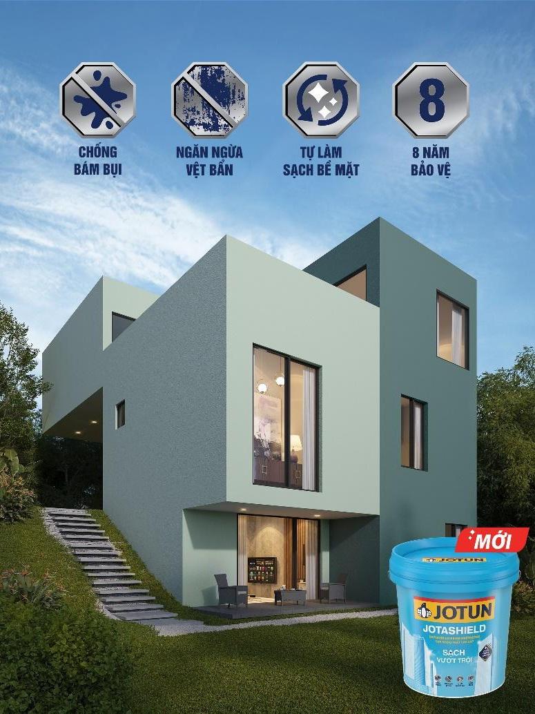 - Jotun Jotashield sạch vượt trội với 3 tính năng chính: chống bám bụi, ngăn ngừa vết bẩn và tự làm sạch bề mặt.