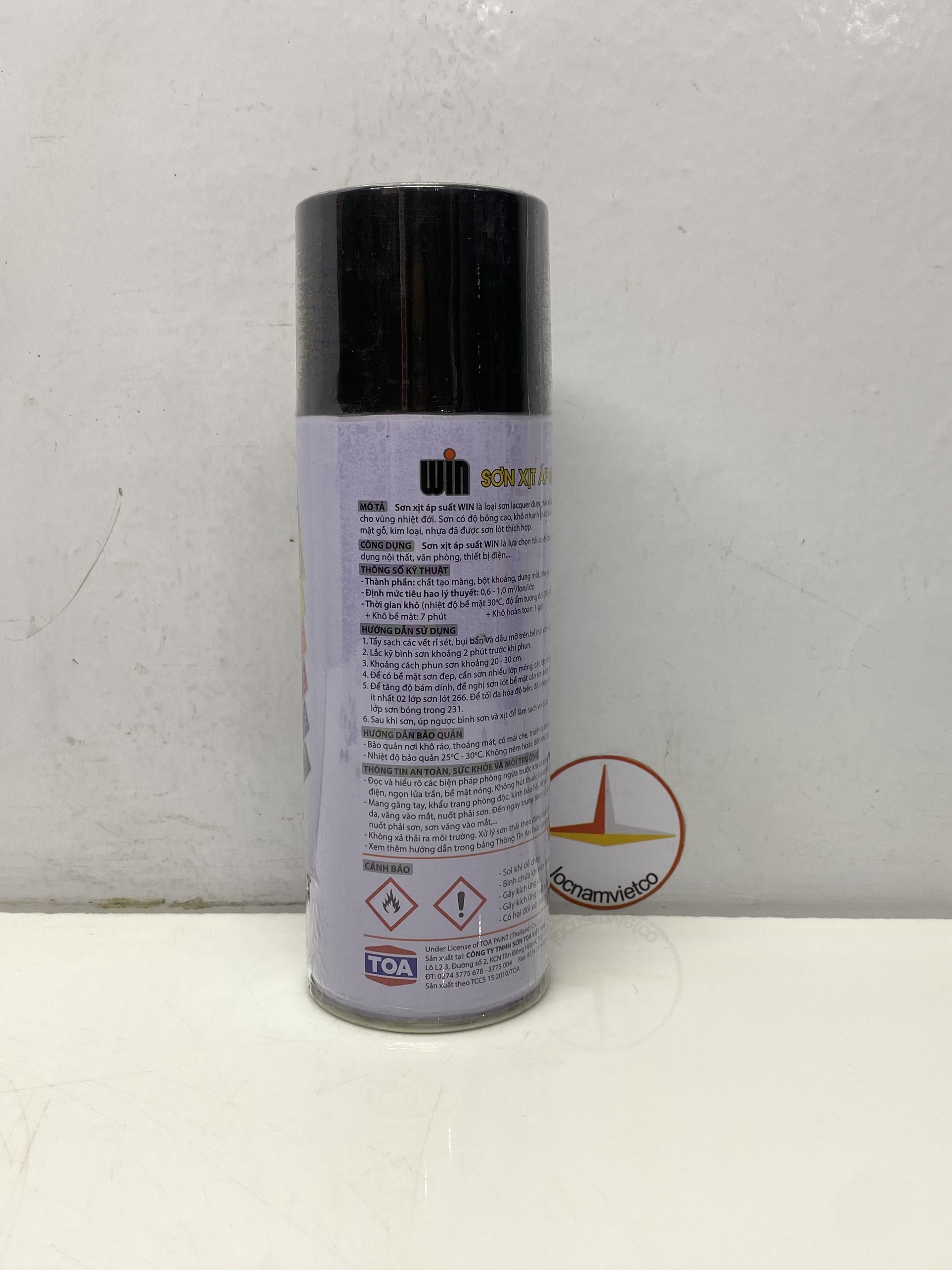 - Khô hoàn toàn:Sau 1 giờ Một số mã màu sơn xịt Win khác: Clear 231(Không màu); màu trắng white 200; màu bạc bright silver; màu đỏ 211 red; màu đen mờ flat black 212; màu đen black 210; màu xanh 224 sky blue; màu xanh 213; màu xanh river blue 242; màu xanh ford tractor blue 238; màu xanh đen dark blue 216; màu tím 240 violet; turquoise 223; màu xanh apple green 217; màu xanh green 214; màu black board green 225; machine green 281; olive green 268; màu kem 219 cream; màu vàng yellow 218; màu vàng medium yellow 241 màu cam 226 orange; màu hồng pink 229; màu xanh đen dark green 230; màu trắng xám 232; màu xám kusota 958; màu xám grey 215; màu xám sáng light grey 221; màu xám medium grey 220; màu nâu cocoa brown 265; màu đỏ deep red 239; màu maroon new 222; màu grey A70 Sơn xe mô tô, xe máy, xe đạp WIN: Màu mêta đỏ candy red 236; màu meta xanh wave green A007; màu meta xanh dương candy blue 235; Màu nho dream H012; Sơn nhũ bạc meta hat nhỏ undercoat silver A100; sơn nhũ bạc mê ta hạt lớn candy tone 404 màu candy green 234; màu mêta đồng gold 228. Sơn xịt màu đặc biệt: Màu xi mạ vàng K83 Pearl gold Sơn xịt chịu nhiệt(600 độ C/ 1200 độ F): Sơn chịu nhiệt đen mờ H51, sơn chịu nhiệt bạc sáng H52 Sơn lót chống rỉ: Sơn lót màu xám primer surfacer grey 266; sơn lót chống rỉ màu đỏ chu Anti-rust primer 267. HƯỚNG DẪN THI CÔNG: