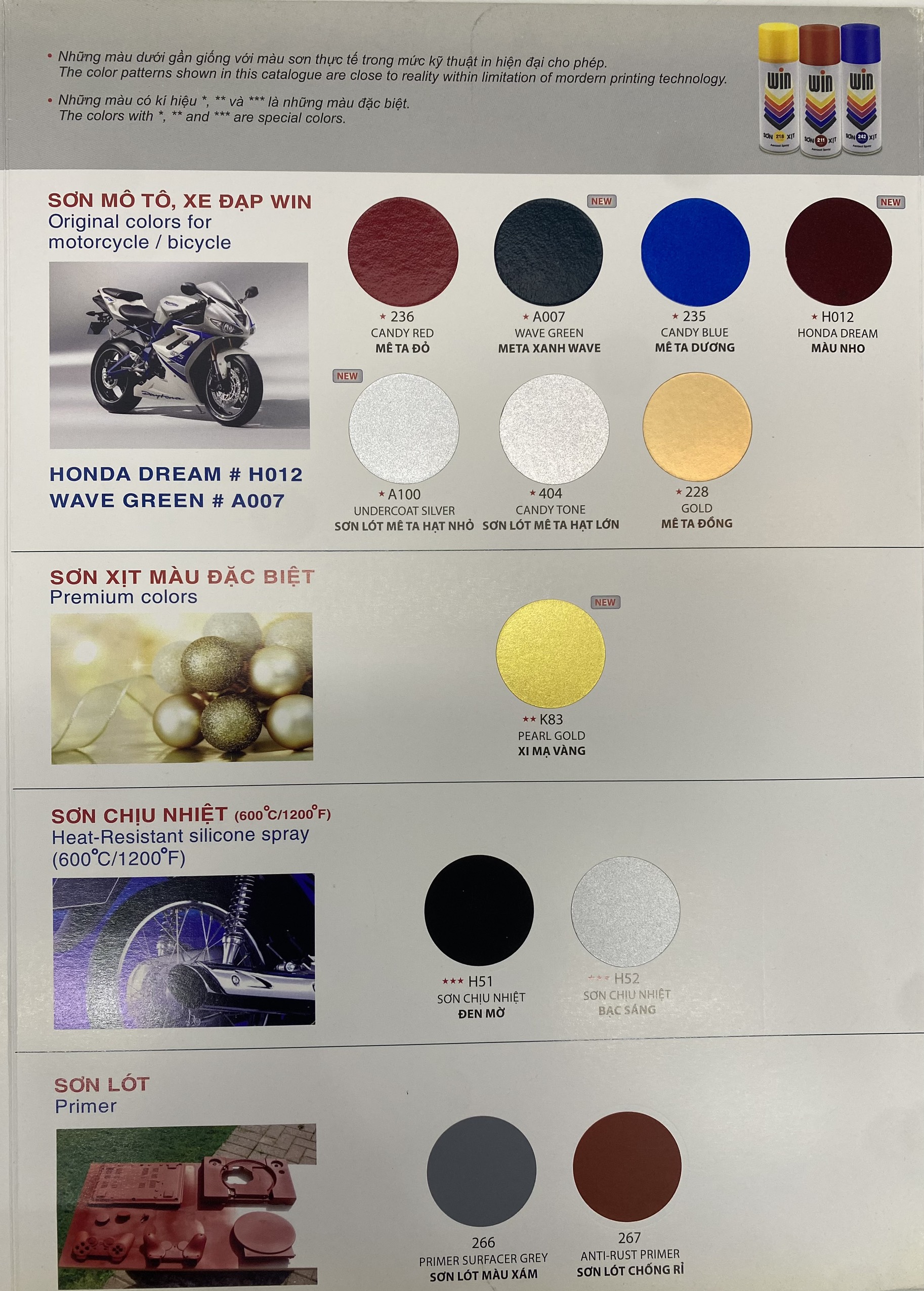 - Khô hoàn toàn:Sau 1 giờ Một số mã màu sơn xịt Win khác: Clear 231(Không màu); màu trắng white 200; màu bạc bright silver; màu đỏ 211 red; màu đen mờ flat black 212; màu đen black 210; màu xanh 224 sky blue; màu xanh 213; màu xanh river blue 242; màu xanh ford tractor blue 238; màu xanh đen dark blue 216; màu tím 240 violet; turquoise 223; màu xanh apple green 217; màu xanh green 214; màu black board green 225; machine green 281; olive green 268; màu kem 219 cream; màu vàng yellow 218; màu vàng medium yellow 241 màu cam 226 orange; màu hồng pink 229; màu xanh đen dark green 230; màu trắng xám 232; màu xám kusota 958; màu xám grey 215; màu xám sáng light grey 221; màu xám medium grey 220; màu nâu cocoa brown 265; màu đỏ deep red 239; màu maroon new 222; màu grey A70 Sơn xe mô tô, xe máy, xe đạp WIN: Màu mêta đỏ candy red 236; màu meta xanh wave green A007; màu meta xanh dương candy blue 235; Màu nho dream H012; Sơn nhũ bạc meta hat nhỏ undercoat silver A100; sơn nhũ bạc mê ta hạt lớn candy tone 404 màu candy green 234; màu mêta đồng gold 228. Sơn xịt màu đặc biệt: Màu xi mạ vàng K83 Pearl gold Sơn xịt chịu nhiệt(600 độ C/ 1200 độ F): Sơn chịu nhiệt đen mờ H51, sơn chịu nhiệt bạc sáng H52 Sơn lót chống rỉ: Sơn lót màu xám primer surfacer grey 266; sơn lót chống rỉ màu đỏ chu Anti-rust primer 267. HƯỚNG DẪN THI CÔNG: