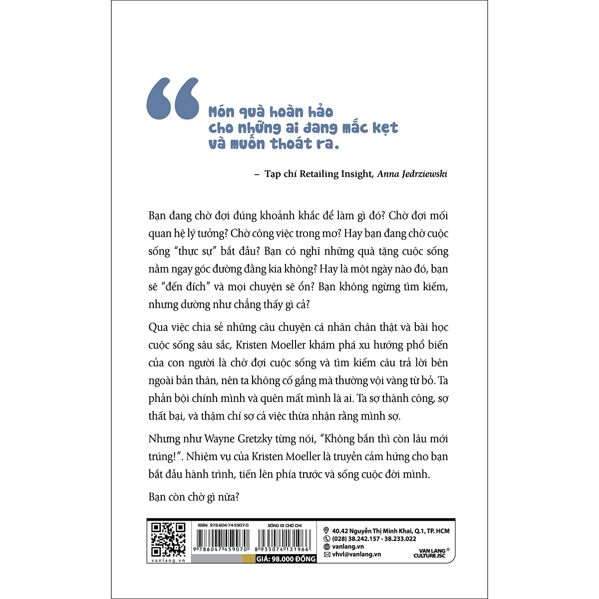 - Tạp chí Retailing Insight, Anna Jedrziewski Bạn đang chờ đợi đúng khoảnh khắc để làm gì đó? Chờ đợi mối quan hệ lý tưởng? Chờ công việc trong mơ? Hay bạn đang chờ cuộc sống “thực sự” bắt đầu? Bạn có nghĩ những quà tặng cuộc sống nằm ngay góc đường đằng kia không? Hay là một ngày nào đó, bạn sẽ “đến đích” và mọi chuyện sẽ ổn? Bạn không ngừng tìm kiếm, nhưng dường như chẳng thấy gì cả? Qua việc chia sẻ những câu chuyện cá nhân chân thật và bài học cuộc sống sâu sắc, Kristen Moeller khám phá xu hướng phổ biến của con người là chờ đợi cuộc sống và tìm kiếm câu trả lời bên ngoài bản thân, nên ta không cố gắng mà thường vội vàng từ bỏ. Ta phản bội chính mình và quên mất mình là ai. Ta sợ thành công, sợ thất bại, và thậm chí sợ cả việc thừa nhận rằng mình sợ. Nhưng như Wayne Gretzky từng nói, “Không bắn thì còn lâu mới trúng!”. Nhiệm vụ của Kristen Moeller là truyền cảm hứng cho bạn bắt đầu hành trình, tiến lên phía trước và sống cuộc đời mình. Bạn còn chờ gì nữa?