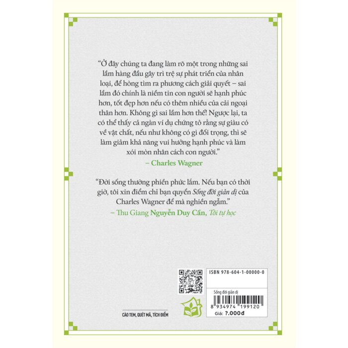 Sống Đời Giản Dị Sống đời giản dị chứa đựng những khám phá của Charles Wagner về giá trị của việc sống giản dị giữa sự phức tạp của xã hội hiện đại. Tác giả ủng hộ việc tổ chức một đời sống giản dị, một đời sống với quan niệm biết chọn lựa những gì là chính yếu và biết bỏ qua những gì là phụ thuộc. Ông khuyến khích độc giả xem xét lại các ưu tiên của mình và nhấn mạnh tầm quan trọng của sự hoàn thiện bên trong hơn là sự giàu có bên ngoài. Bằng cách đó, con người sẽ tìm thấy hạnh phúc, bình yên về mặt tinh thần và cuộc sống của con người cũng sẽ trở nên ý nghĩa hơn.