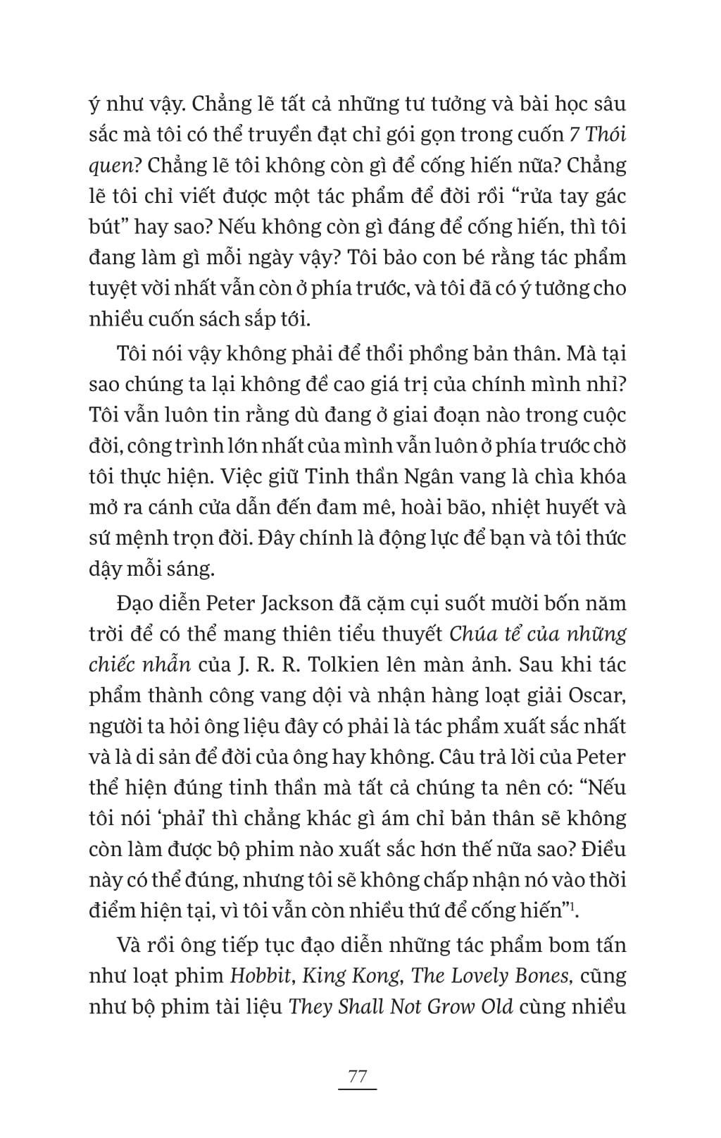 Sống Đời Ngân Vang - Việc Quan Trọng Nhất Vẫn Luôn Ở Phía Trước Quyển sách Live Life in Crescendo được viết bởi Stephen R. Covey và Cynthia Covey, là một tác phẩm mang thông điệp mạnh mẽ về việc sống một cuộc sống đầy ý nghĩa và phát triển không ngừng. Đây là một cuốn sách khuyến khích người đọc tạo ra một ảnh hưởng tích cực trong cuộc sống, thông qua việc sống theo các giá trị bền vững, phát triển cá nhân và đóng góp cho cộng đồng. Cuốn sách gợi nhắc rằng mỗi chúng ta đều có câu chuyện riêng, đều phải trãi qua những nỗi đau và những biến cố trong đời, nhưng ai cũng có sức mạnh nội tại để đứng dậy và bước tiếp. Chúng ta không chỉ vượt qua những điều tưởng chừng như không thể, mà còn tiếp tục sống để tìm lại niềm hạnh phúc trong đời. Dù bạn đang có được thành công hay đối mặt với nghịch cảnh, cảm thấy trì trệ, bế tắc... có thể quãng thời gian tuyệt vời nhất vẫn đang chờ đợi bạn ở phía trước. Cuốn sách này là một lời kêu gọi sống trọn vẹn, tạo ra một cuộc sống đầy ý nghĩa và đóng góp vào sự thay đổi tích cực trong thế giới xung quanh chúng ta. Nó có thể là một nguồn động lực cho những ai đang tìm kiếm một phương hướng sống với mục tiêu và sức ảnh hưởng mạnh mẽ.