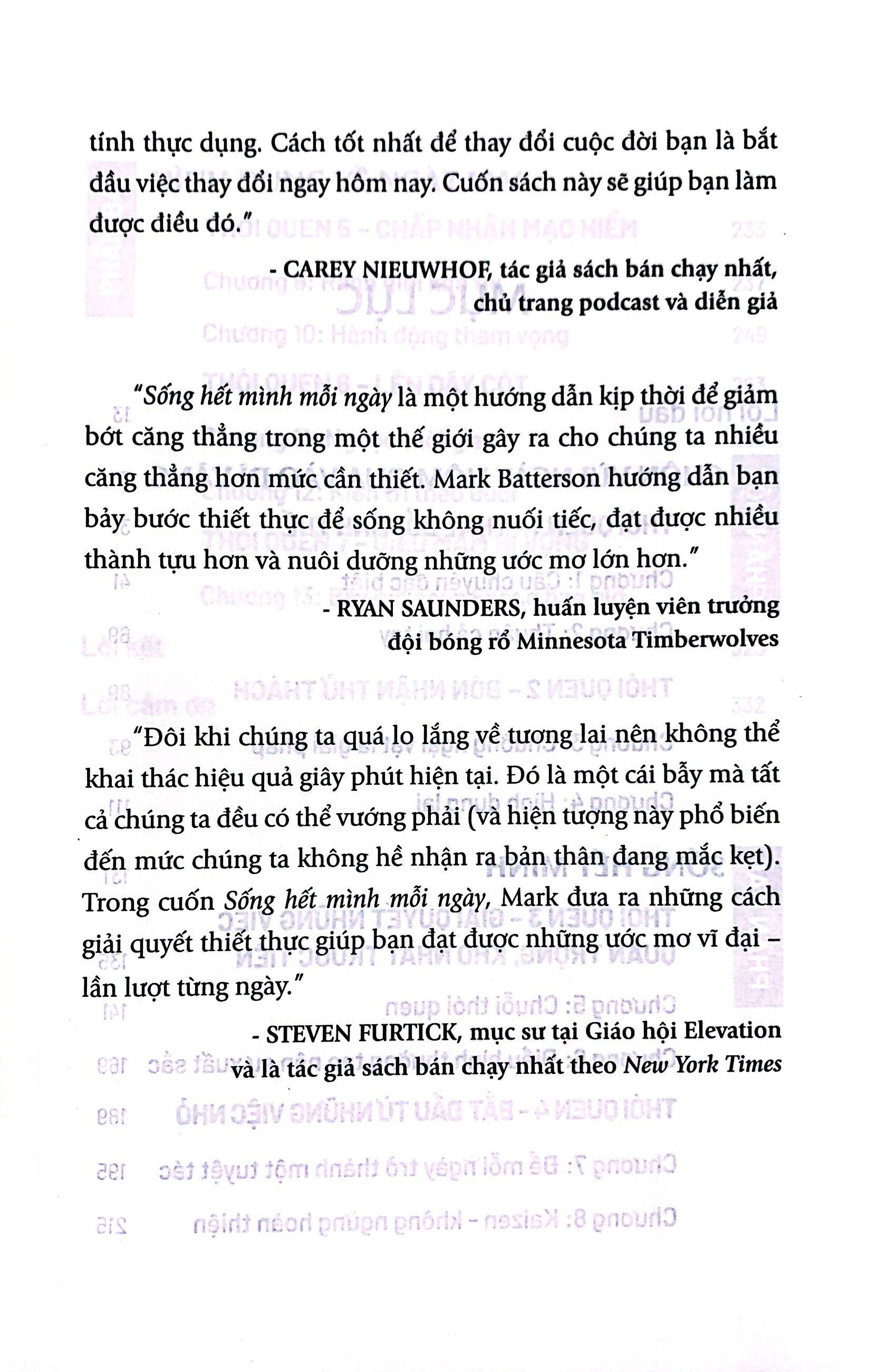 Mua tại TiktokMark Batterson được biết đến là tác giả có sách bán chạy nhất theo bình chọn của New York Times. Ông viết nên cuốn Sống hết mình mỗi ngày với mong muốn chia sẻ 7 thói quen giúp mỗi chúng ta trở nên hạnh phúc và thành công. Các thói quen đó giống như bước khởi đầu giúp bạn thực hiện từng mục tiêu một, từ mục tiêu nhỏ đến mục tiêu cuộc đời mình trong từng ngày sống. Theo tác giả Mark Batterson, chúng ta đang đánh giá quá cao những gì mình có thể đạt được trong thời gian ngắn, nhưng lại đánh giá quá thấp những gì có thể đạt được khi kiên định đi theo một hướng trong thời gian dài. Nếu bạn chủ động đạt được các mục tiêu dài hạn, thì bạn sẽ sống cuộc đời ý nghĩa hơn.