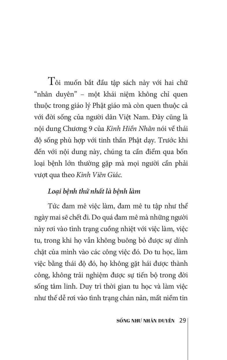 Tựa sách Sống như nhân duyên: Nghệ thuật nhìn người là những lời chia sẻ có giá trị với quý độc giả trong cuộc sống, trong tương giao xã hội và trong việc điều chỉnh bản thân để sống hạnh phúc hơn. Kinh Hiền Nhân không chỉ dạy cho chúng ta cách nhìn nhận tư cách đạo đức của người khác mà còn là một nền tảng để mỗi người tự dựa vào, soi lại bản thân mình và điều phục để phát triển tốt hơn.