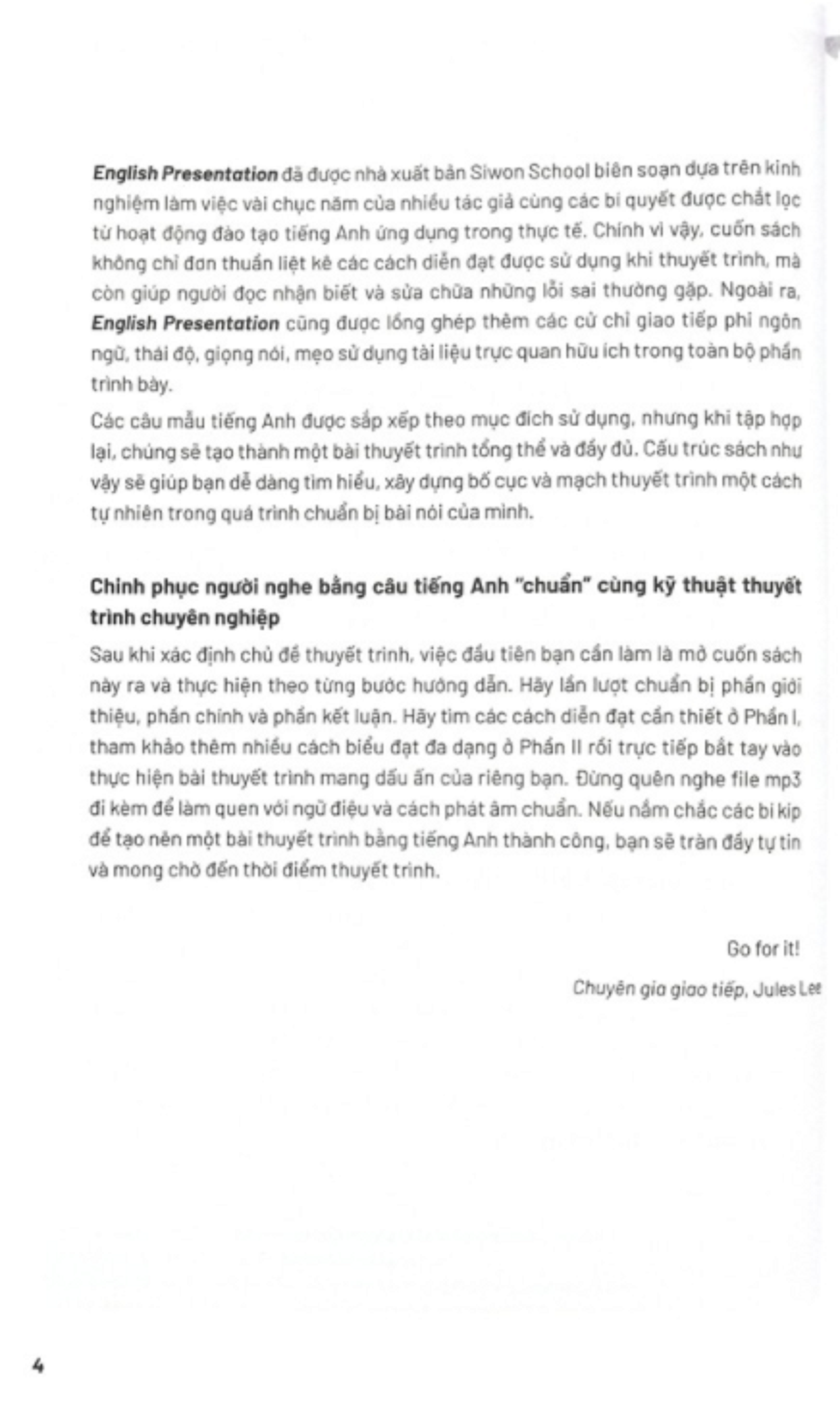 - Phân tích các yếu tố cần quan tâm khi thực hiện thuyết trình bằng tiếng Anh. Về hình thức: Sách được thiết kế đẹp, hiện đại. Bố cục nội dung rất khoa học, sắp xếp và chia rõ từng bước.