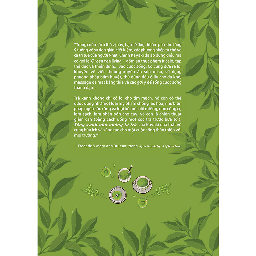 Trà xanh không chỉ có lợi cho tim mạch, nó còn có thể được dùng như một loại mỹ phẩm chống lão hóa, như biện pháp ngừa sâu răng và loại bỏ mùi hôi miệng, như công cụ làm sạch, làm phân bón cho cây, và còn là chiến thuật giảm cân (bằng cách uống một cốc trà trước bữa tối). Sống Xanh Như Những Lá Trà của Kayaki quả thật vô cùng hữu ích và sáng tạo cho một cuộc sống thân thiện với môi trường.
