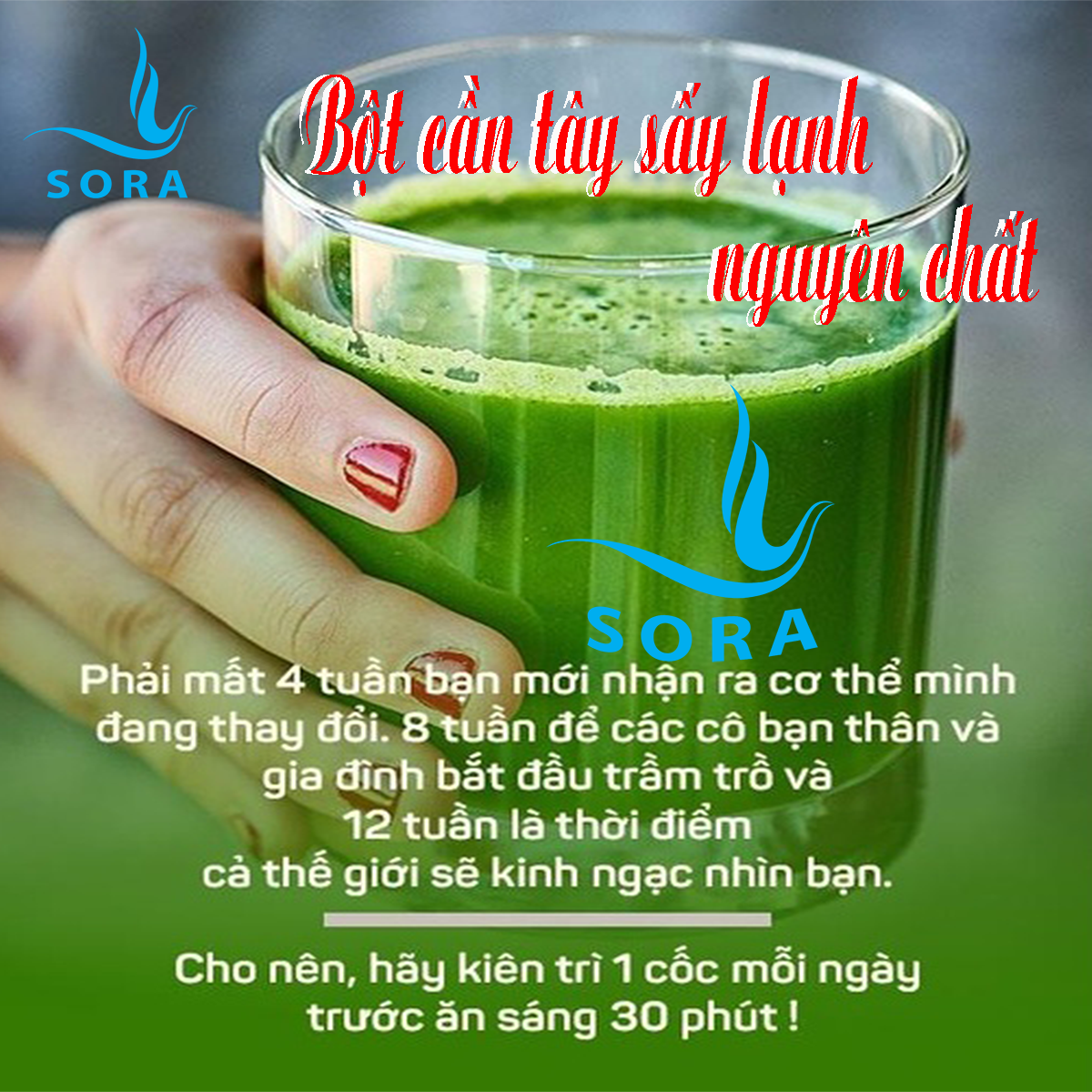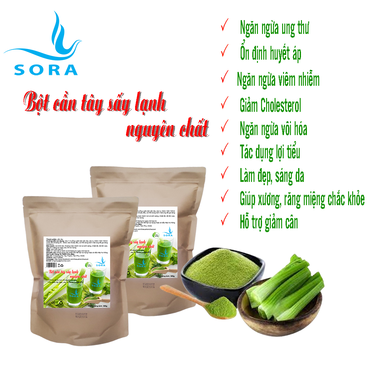 Bột cần tây sấy lạnh nguyên chất Sora là sản phẩm tự nhiên được sấy lạnh hoàn toàn từ rau cần tây tươi, không hề có chất bảo quản nên sẽ giữ nguyên vẹn được độ tinh khiết của các dưỡng chất bên trong. Bột cần tây sấy lạnh nguyên chất Sora chứa rất nhiều thành phần dinh dưỡng quan trọng và các khoáng chất vi lượng như canxi, sắt, chất xơ,... Song song đó thì tinh dầu tự nhiên có trong Bột cần tây sấy lạnh nguyên chất Sora sẽ giúp mọi người an thần cực tốt.