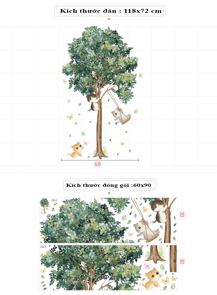 ✨Sticker Giấy Dán Tường Decal Dán tường Tranh Dán Tường Trang Trí Tường Mẫu Mèo Chơi Xích Đu ZDB-2153