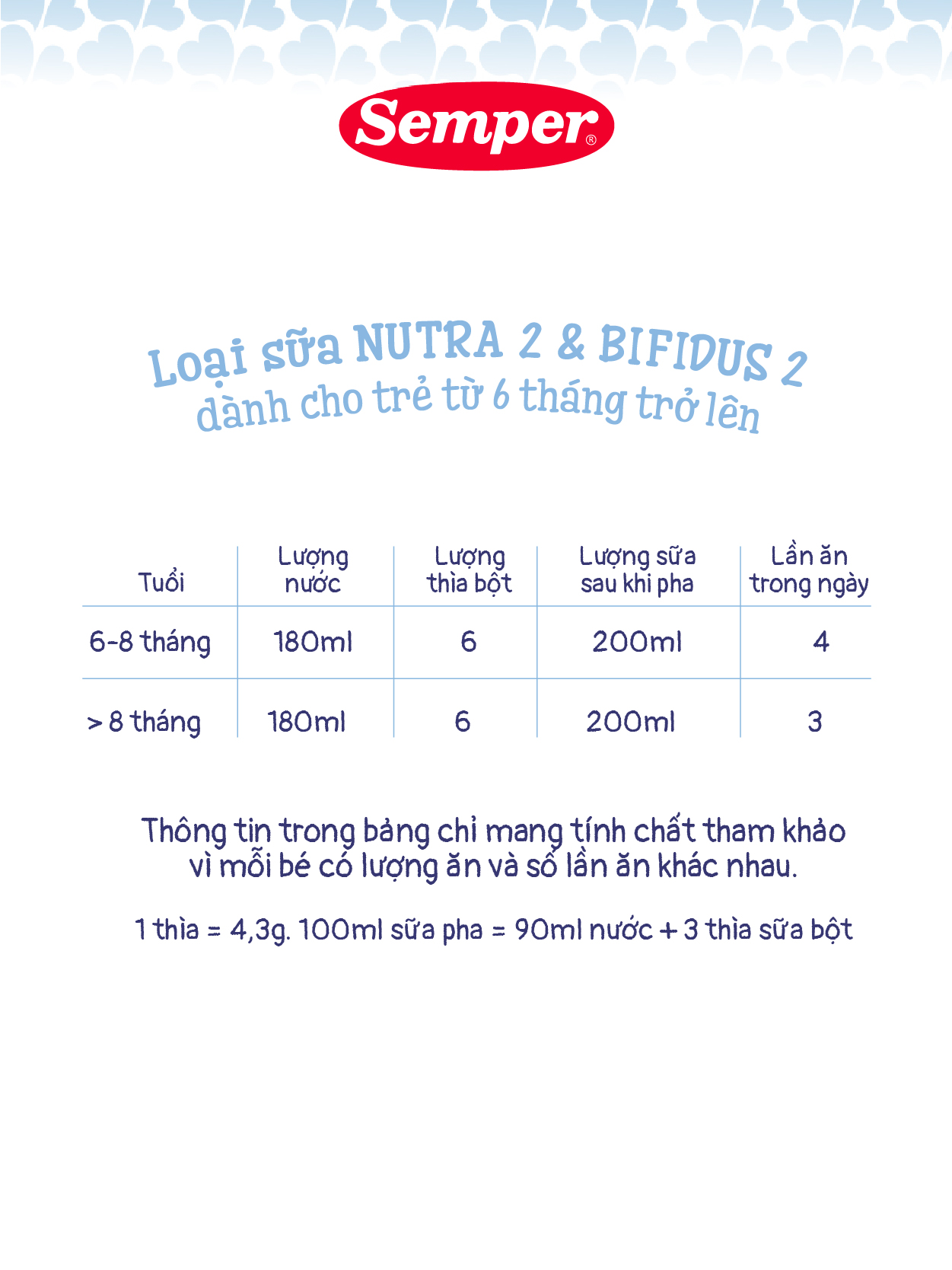 - Trẻ từ 6- 8 tháng tuổi nên uống 4 bữa, mỗi bữa 180ml tương đương 6 thìa sữa bột.
