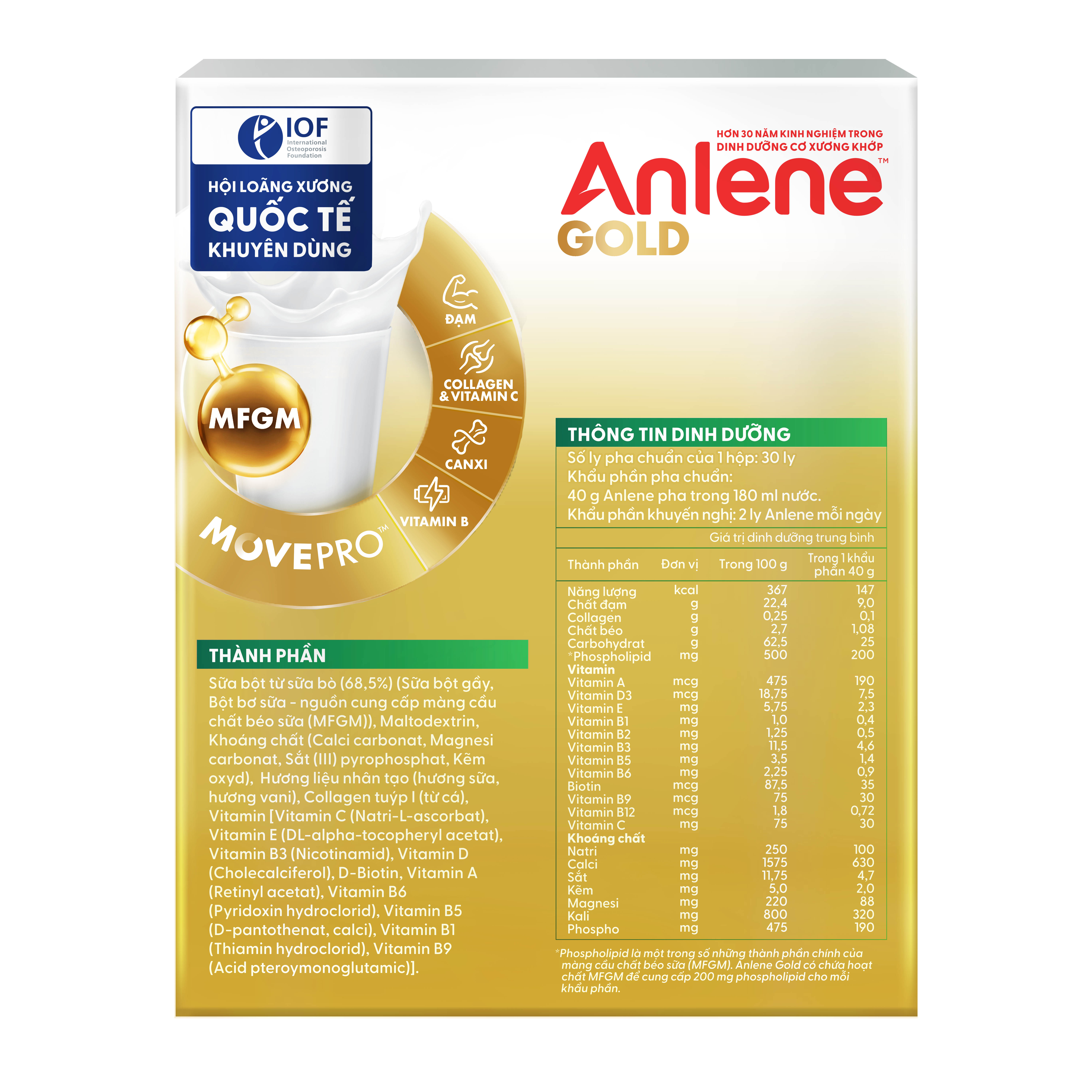 ANLENE GOLD LÀ SẢN PHẨM SỮA CHỨA HỆ DƯỠNG CHẤT MOVEPROCung cấp dinh dưỡng tăng cường với hoạt chất MFGM được KIỂM NGHIỆM LÂM SÀNG giúp cơ thể thêm linh hoạt và Vitamin B tiếp thêm năng lượng.