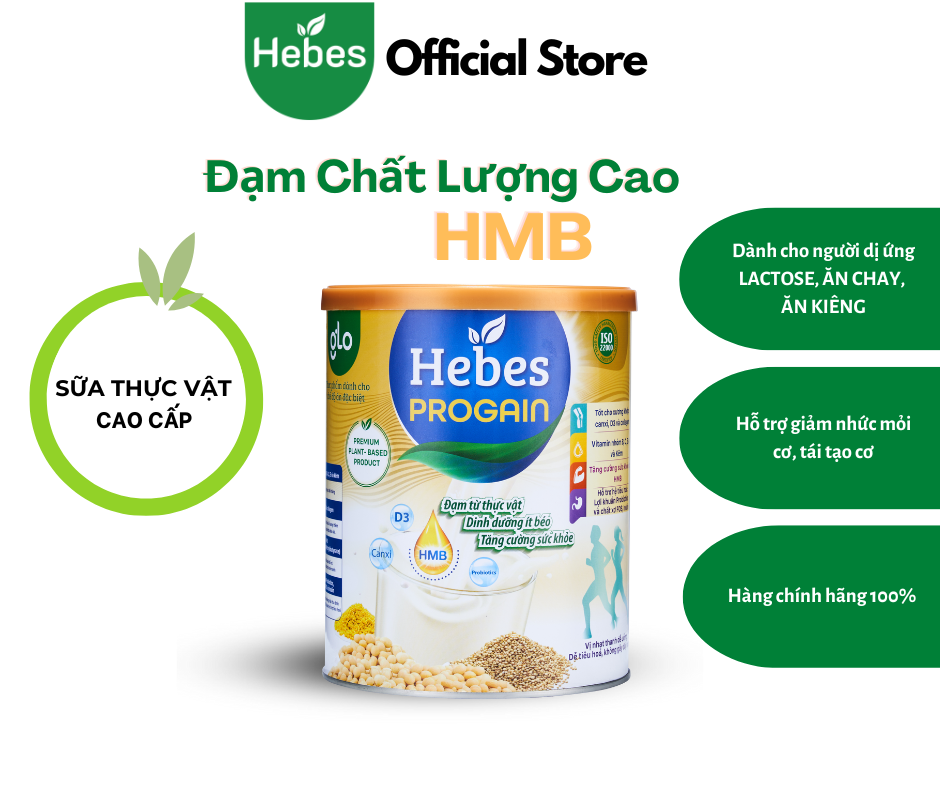 HEBES PROGAIN VỚI CÔNG THỨC ĐỘC QUYỀN 100% TỪ THỰC VẬT VÀ BỔ SUNG HMB GIÚP PHỤC HỒI VÀ GIẢM THIỂU TÌNH TRẠNG NHỨC MỎI CƠ Giới thiệu BỔ SUNG NĂNG LƯỢNG, PHỤC HỒI CƠ VÀ THỂ CHẤT CHO NGƯỜI LỚN TUỔI, NGƯỜI ỐM YẾU CẦN PHỤC HỒI THỂ LỰC Chỉ 2 ly HEBES PROGAIN mỗi ngày, tăng cường khối cơ lành mạnh với công thức kết hợp đạm thực vật cùng dưỡng chất vàng HMB (2,1g/45g bột), dưỡng chất vàng giúp cải thiện scws mạnh và chức năng cơ ở người cao tuổi.
