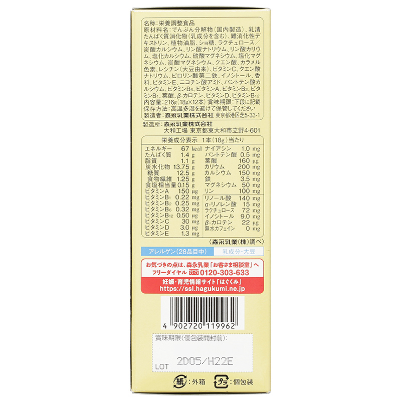 - Chất phân giải tinh bột (trong nước), chất tiêu hóa whey protein (bao gồm thành phần sữa), dextrin khó tiêu hoá, dầu thực vật, đường sucrose, đường lactulose/canxi cacbonat, natri phosphate, kali phosphate, muối canxi clorua, magie sulfat, muối magie clorua, magie cacbonat, axit citric, màu caramel, lecithin (nguồn gốc đậu nành), vitamin C, natri citrat, sắt pyrophosphate, inositol, hương liệu, vitamin E, nicotinamide, canxi pantothenate, vitamin B6, vitamin A, vitamin B2, vitamin B1, axit folic, beta-carotene, vitamin D, vitamin B12 Công dụng Cân bằng dinh dưỡng cho mẹ và bé