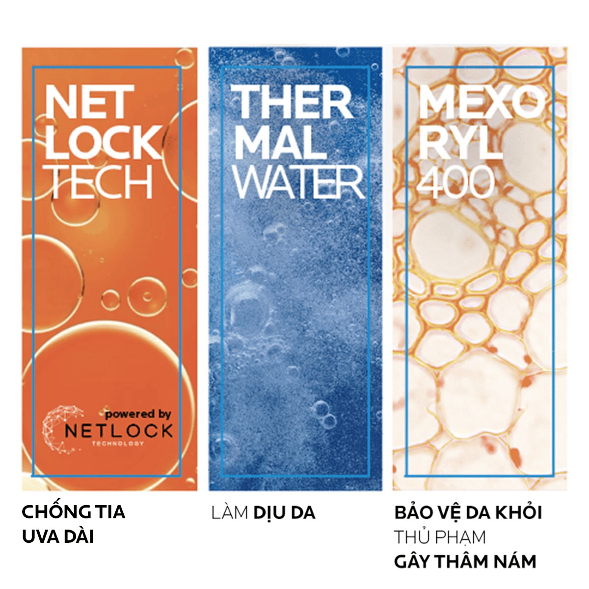 - Kem chống nắng phổ rộng chống được cả UVB và UVA có bước sóng dài. Kem chống nắng cải tiến mới nhất với công nghệ bộ lọc UV Mexoryl 400 và công nghệ Netlock giúp bảo vệ tối đa trước ánh nắng mặt trời.