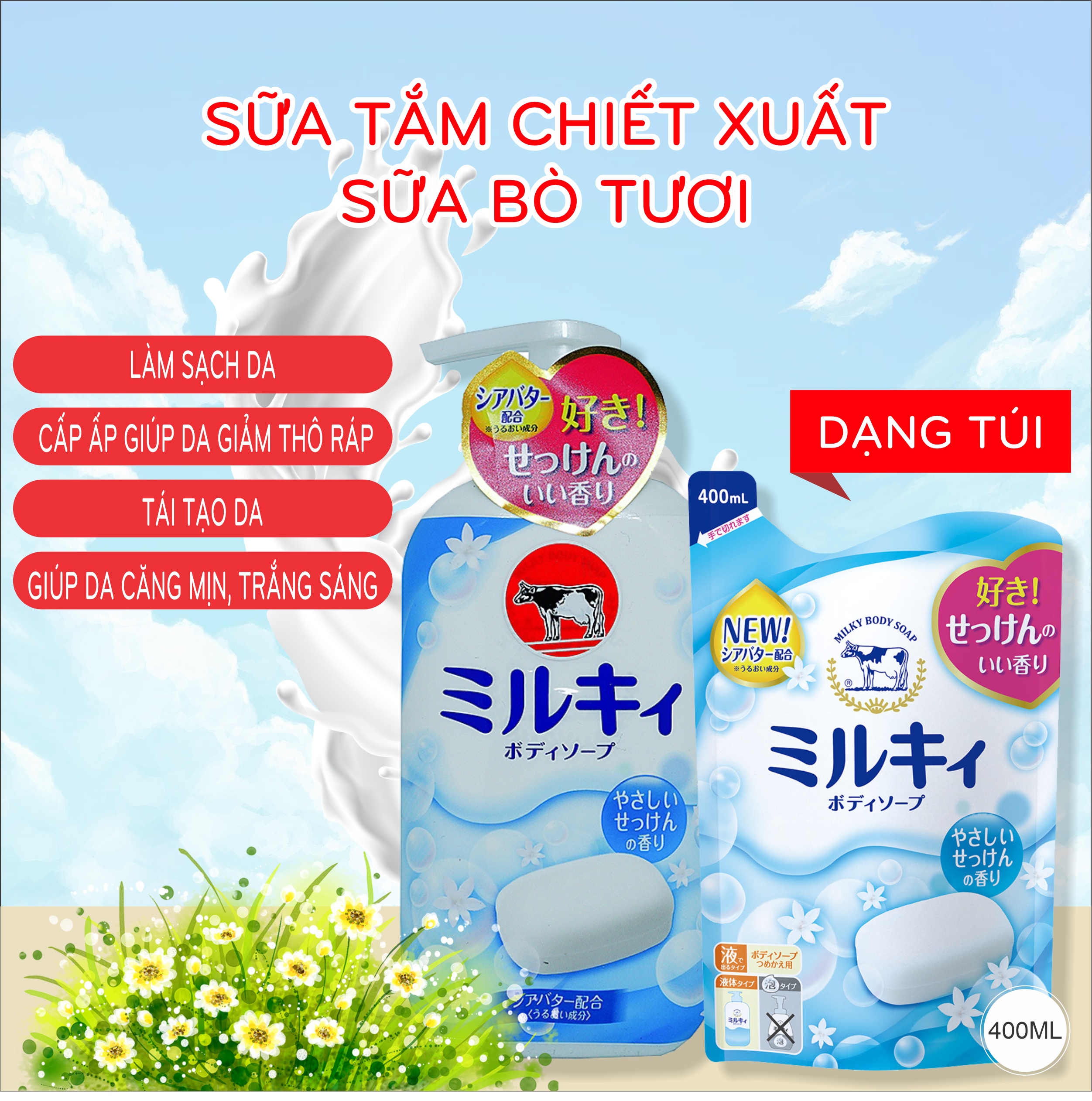 ✨Sữa Tắm Dưỡng Trắng Mịn Da Hương Hoa Cow Milky Body Soap Pump Chiết Xuất Sữa Bò Tươi Refil 400mL
