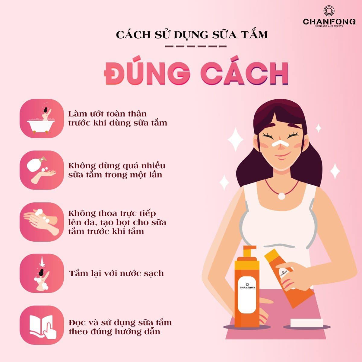 CÁCH SỬ DỤNG: Cho sữa tắm vào lòng bàn tay hoặc bông tắm, tạo bọt rồi mát-xa đều khắp cơ thể. Sau đó tắm lại với nước sạch.