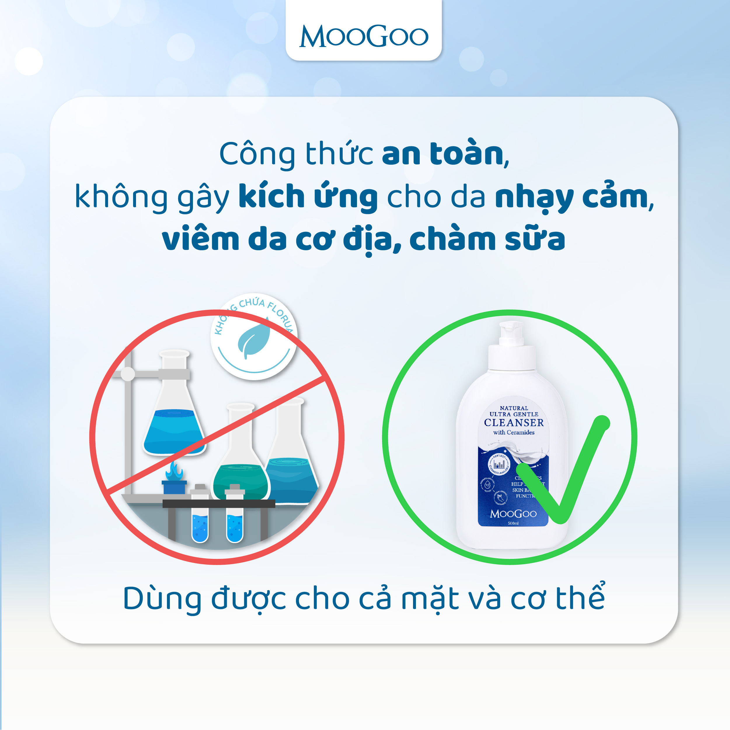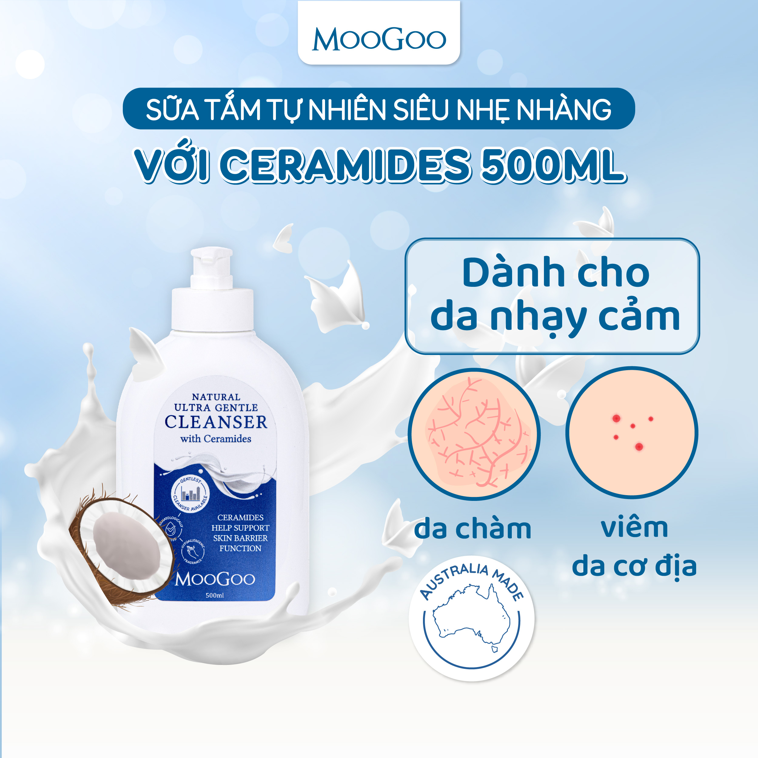 Sữa tắm/ sữa rửa mặt Ultra Gentle Cleanser with Ceramides của MooGoo có công thức làm sạch nhẹ nhàng với các thành phần làm sạch gốc tự nhiên như dừa và Gluco phù hợp cho làn da nhạy cảm và có thể là lựa chọn tốt cho những người bị viêm da cơ địa.