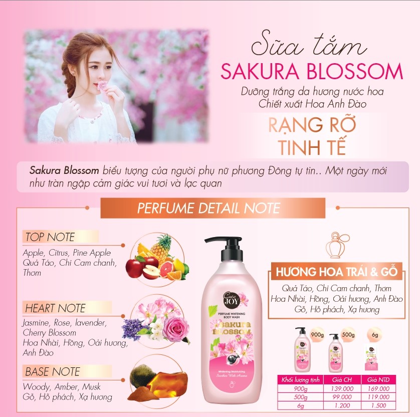 - Mở đầu nốt hương phảng phất hương chanh, cam quýt thanh mát cho cảm giác sảng khoái, đầy tươi mới. Tầng hương kế tiếp mở ra thế giới hoa anh Đào Sakura sâu sắc ngọt ngào, hương nhài, oải hương thoang thoảng với nốt hương cuối cùng ấm áp và trầm lắng như xạ hương, gỗ và hỗ phách. Một ngày mới như tràn ngập cảm giác vui tươi và lạc quan. Sữa tắm Coco Joy Sakura Blossom