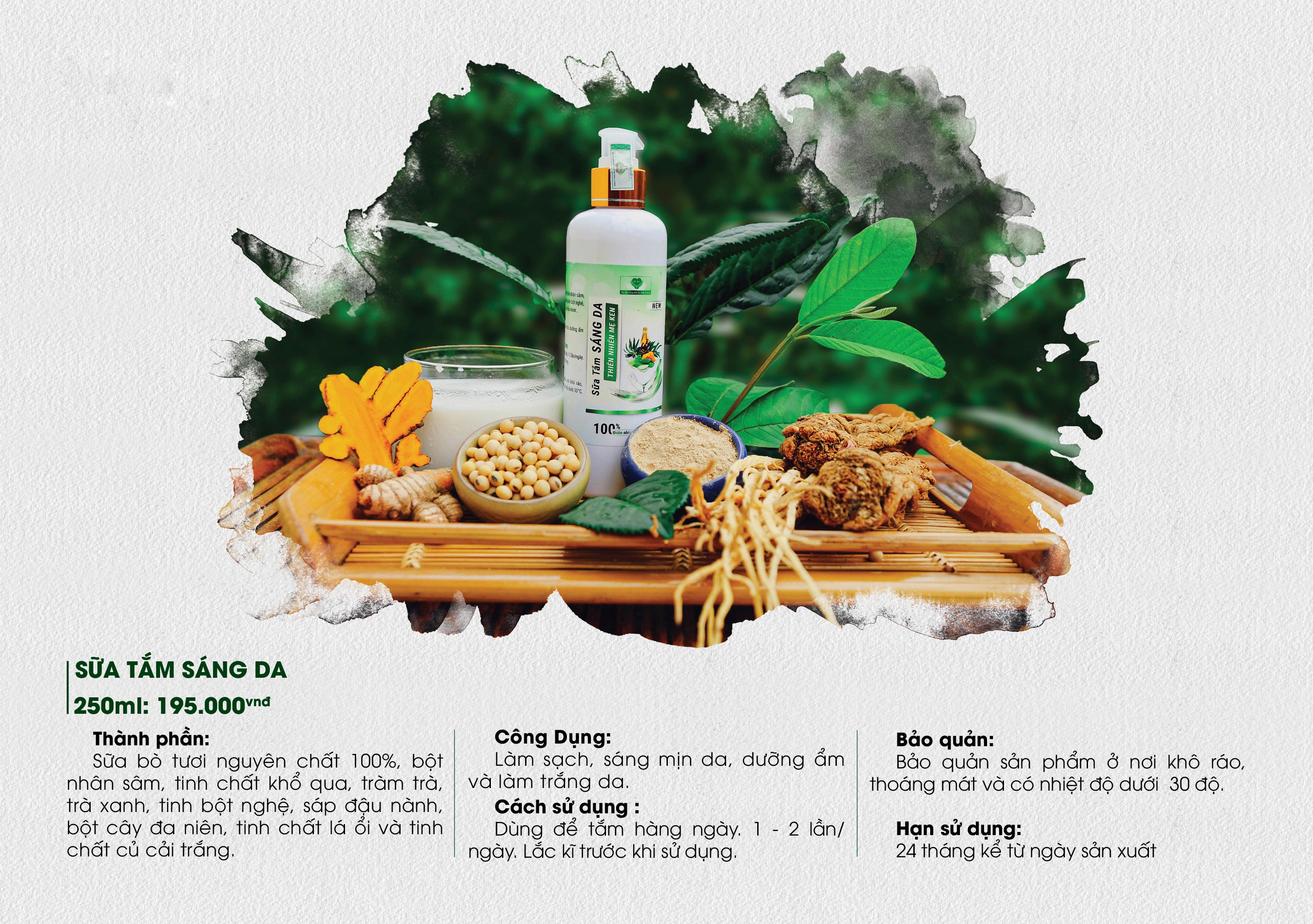 Sữa tắm chiết xuất 100% Thiên nhiên từ các dược liệu quý như: bột nhân sâm, tinh bột nghệ, sáp đậu nành, Sữa bò tươi nguyên chất 100%, tinh chất khổ qua, tràm trà, trà xanh, bột cây đa niên, tinh chất lá ổi và tinh chất củ cải trắng. và 1 số thành phần dược liệu bí truyền v.v....,