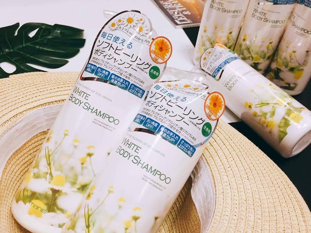 - Edelweiss Extract (chiết xuất từ hoa nhung tuyết) với hương thơm tự nhiên, nhẹ nhàng mà quyến rũ có tác dụng chống oxy hóa, chống lão hóa và tổn thương trên da, chống gốc tự do, chống lại tác hại của tia cực tím giúp da săn chắc, căng mịn, có độ đàn hồi của sự tuơi trẻ. Đặc biệt, sữa tắm White Body Shampoo Manis không chứa cồn, dầu khoáng màu tổng hợp nên rất an toàn khi sử dụng. Giúp tẩy sạch bụi bẩn ngay cả bã bẩn nằm sâu trong lớp biểu bì; giúp tẩy tế bào chết, loại bỏ lớp sừng già trên da; Cung cấp độ ẩm cho da, loại bỏ làn da khô ráp, sần sùi, cho làn da luôn tươi mới, rạng rỡ như da em bé; giúp da trắng sáng tự nhiên, đều màu và căng bóng; hỗ trợ giảm mụn, vết thâm trên da; Sử dụng White Body Shampoo Manis thường xuyên giúp ngăn ngừa các dấu hiệu lão hóa da, da chảy xệ một cách hiệu quả; Với hương thơm dịu nhẹ từ hoa nhung tuyết, White Body Shampoo Manis giúp tinh thần thư giãn, thoải mái sau những giờ làm việc, học tập căng thẳng. Bạn sẽ có cảm giác như đang được chăm sóc da tại các Spa chuyên nghiệp. HDSD: Làm ướt da toàn thân bằng nước ấm; Lấy một lượng vừa đủ sữa tắm ra tay hoặc bông tắm; Xoa đều sữa tắm lên toàn thân và mát xa trong vòng 5-10 phút để các dưỡng chất thấm sâu vào trong da; Làm sạch cơ thể lại với nước sạch.