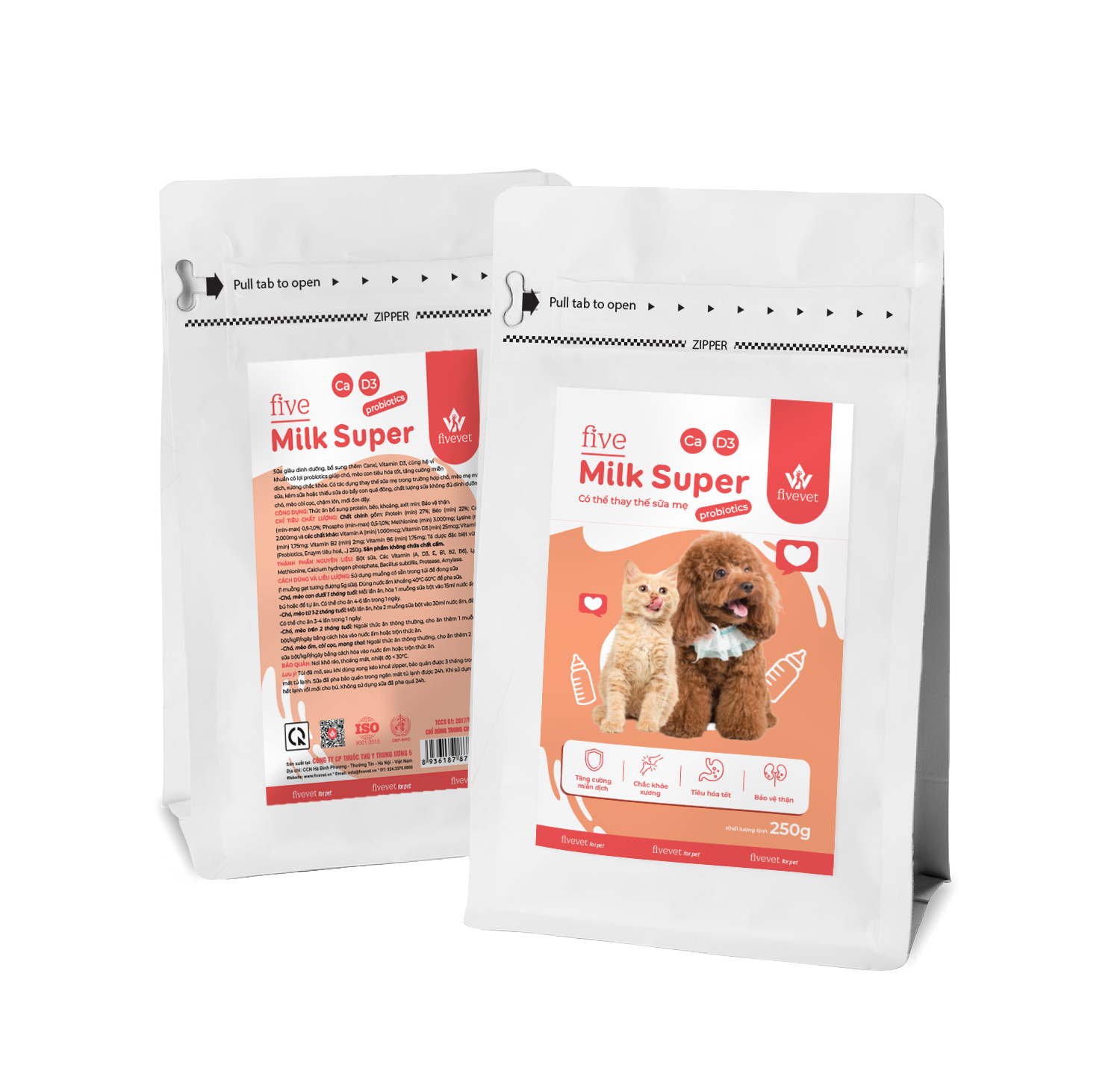 Sữa Tăng Cường Miễn Dịch five Milk Super For Pet Cho Thú Cưng 250g - Fivevet ️CÔNG DỤNG: Five-Milk super (for pet) là sản phẩm sữa giàu dinh dưỡng, bổ sung thêm Canxi, Vitamin D3, cùng hệ vi khuẩn có lợi probiotics giúp chó, mèo con tiêu hóa tốt, tăng cường miễn dịch, xương chắc khỏe. Có tác dụng thay thế sữa mẹ trong trường hợp chó, mèo mẹ mất sữa, kém sữa hoặc thiếu sữa do bầy con quá đông, chất lượng sữa không đủ dinh dưỡng; chó, mèo còi cọc, chậm lớn, mới ốm dậy.